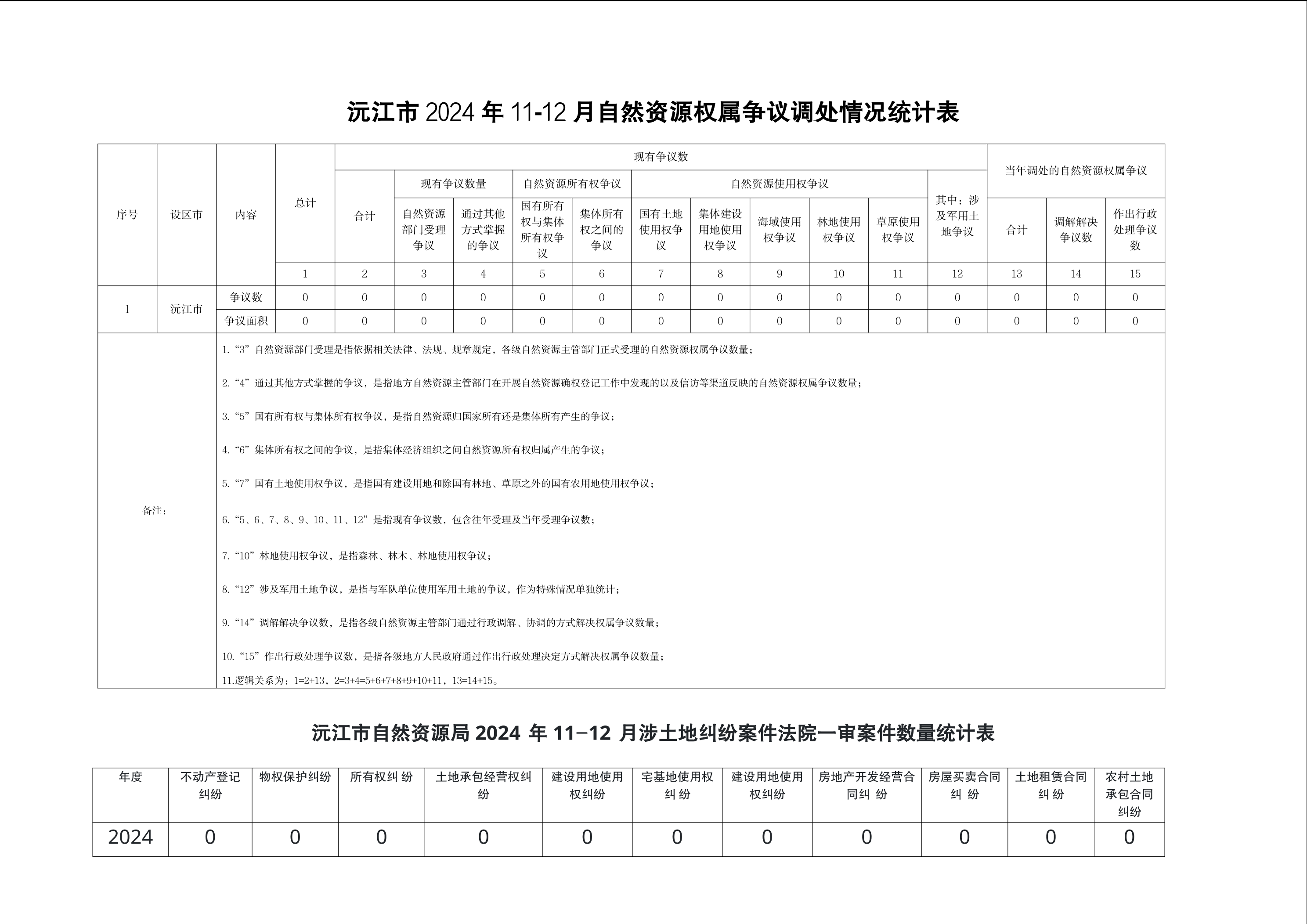 沅江市2024年11-12月自然资源权属争议调处情况及涉土地纠纷案件法院一审案件数量统计表