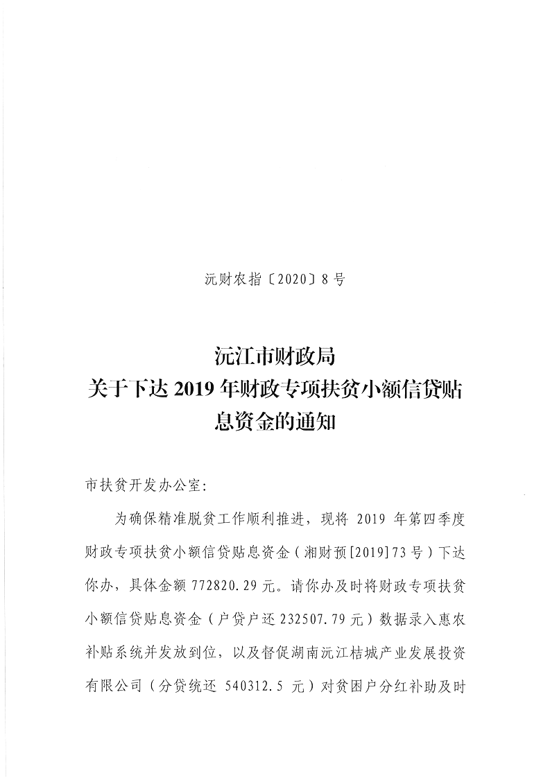 沅江市财政局关于下达2019年财政专项扶贫小额信贷贴息资金的通知 沅财农指[2020]8号.pdf 沅江市2019年第四季度扶贫小额信贷贴息汇总表及明细.xlsx