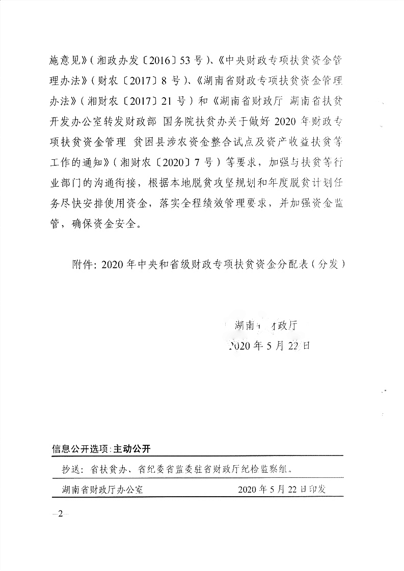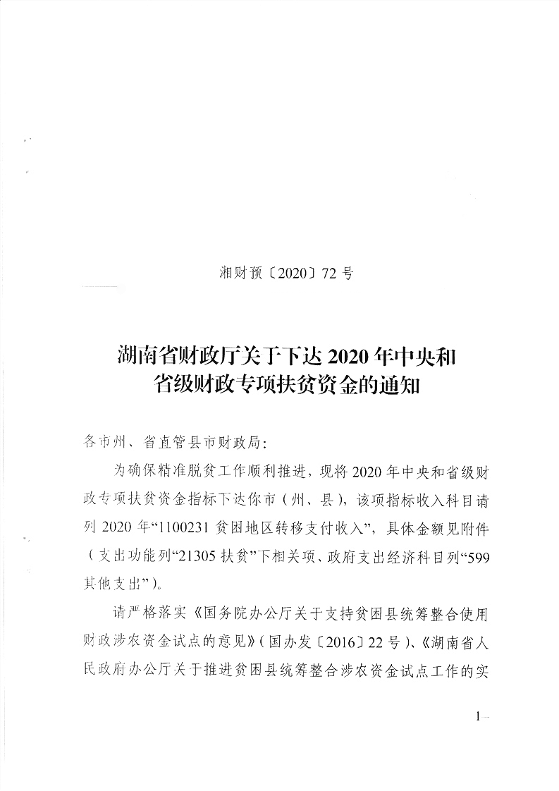 湖南省财政厅关于下达2020年中央和省级财政专项扶贫资金的通知 湘财预[2020]72号
