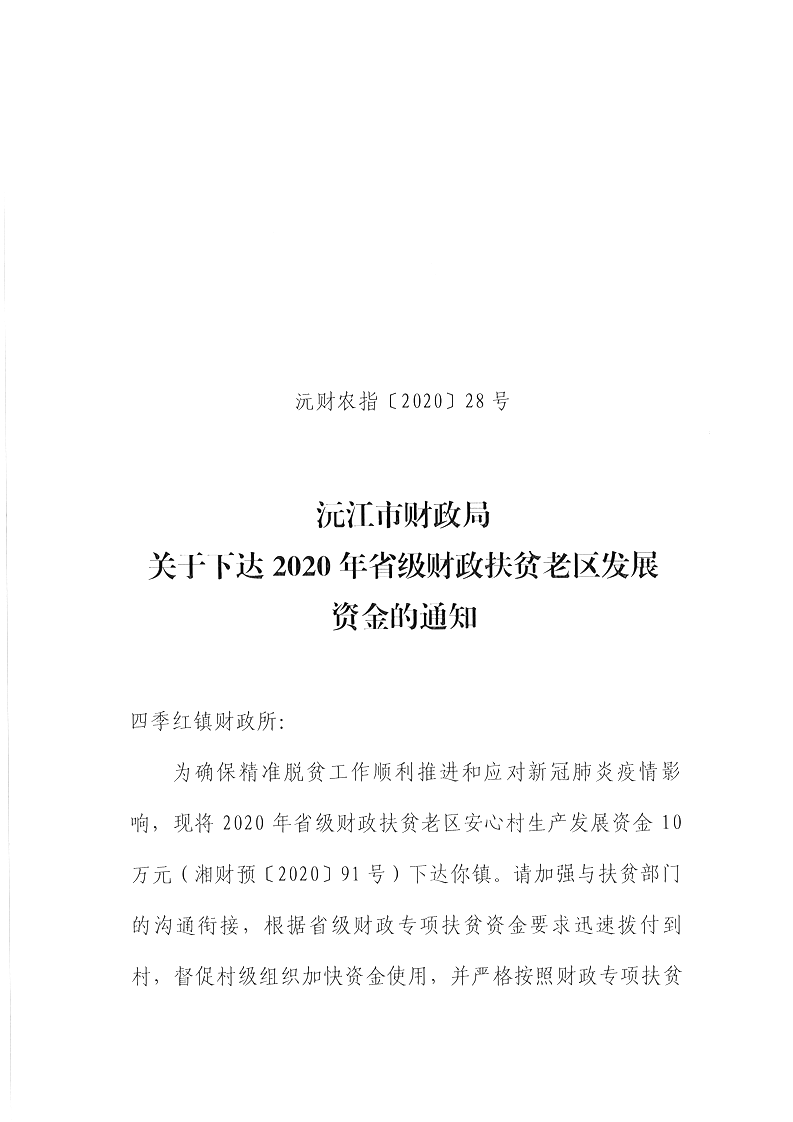 沅江市财政局关于下达2020年省级财政扶贫老区发展资金的通知 沅财农指[2020]28号