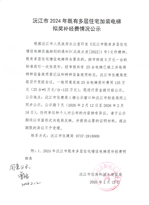 沅江市2024年既有多层住宅加装电梯拟奖补经费情况公示