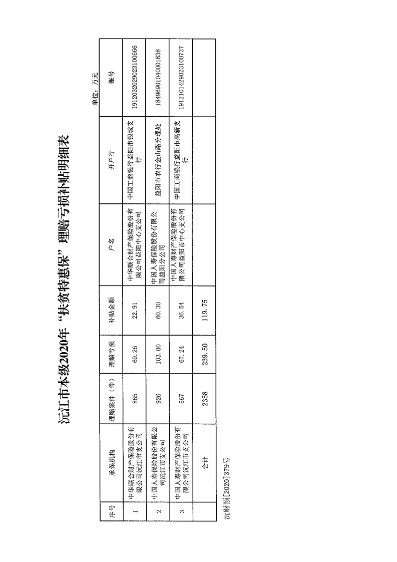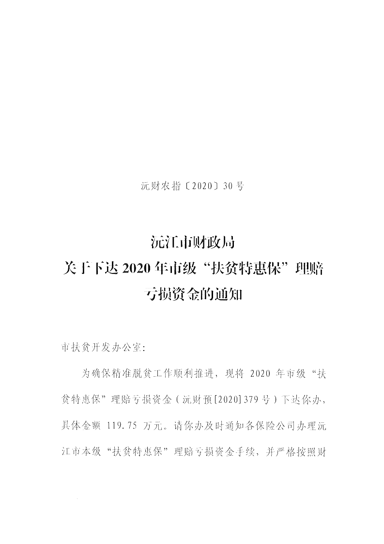 沅财农指【2020】30号 沅江市财政局关于下达2020年市级“扶贫特惠保”理赔亏损资金的通知