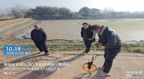 2026年1月7日,沅江市畜牧水产事务中心水产技术推广站工作人员赴黄茅洲镇、阳罗洲镇、共华镇,实地查看渔业高质量发展补助项目施工进度。
