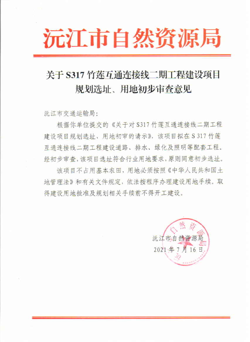 S317竹莲互通连接线二期工程项目规划选址、用地初步审查意见