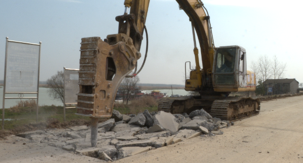 在施工现场,施工人员正在清运砂石,并利用轰炮机、挖机敲碎水泥路面,准备开始下一阶段的施工。湖南博汇工程项目管理有限公司总经理王书鹏介绍,当前第一阶段是做路沿石,把路面外层进行处理,再开始进行第二阶段。第二阶段是修建防护栏、路灯等基础设施。