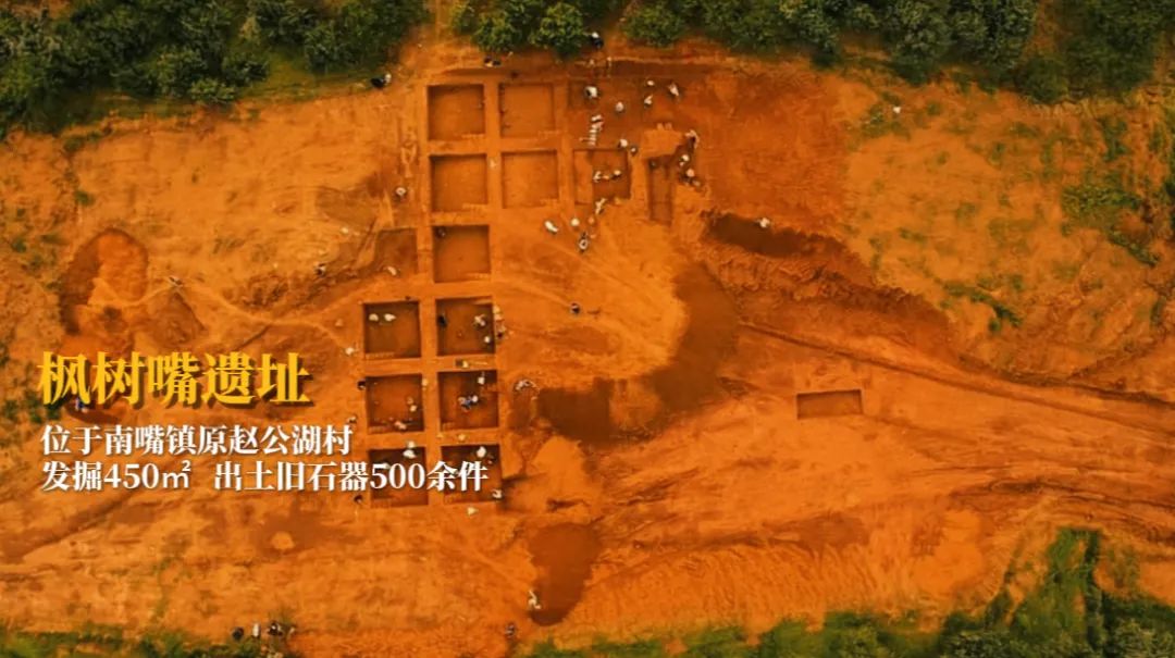 枫树嘴遗址,位于南嘴镇原赵公湖村,发掘450㎡,出土旧石器500余件;