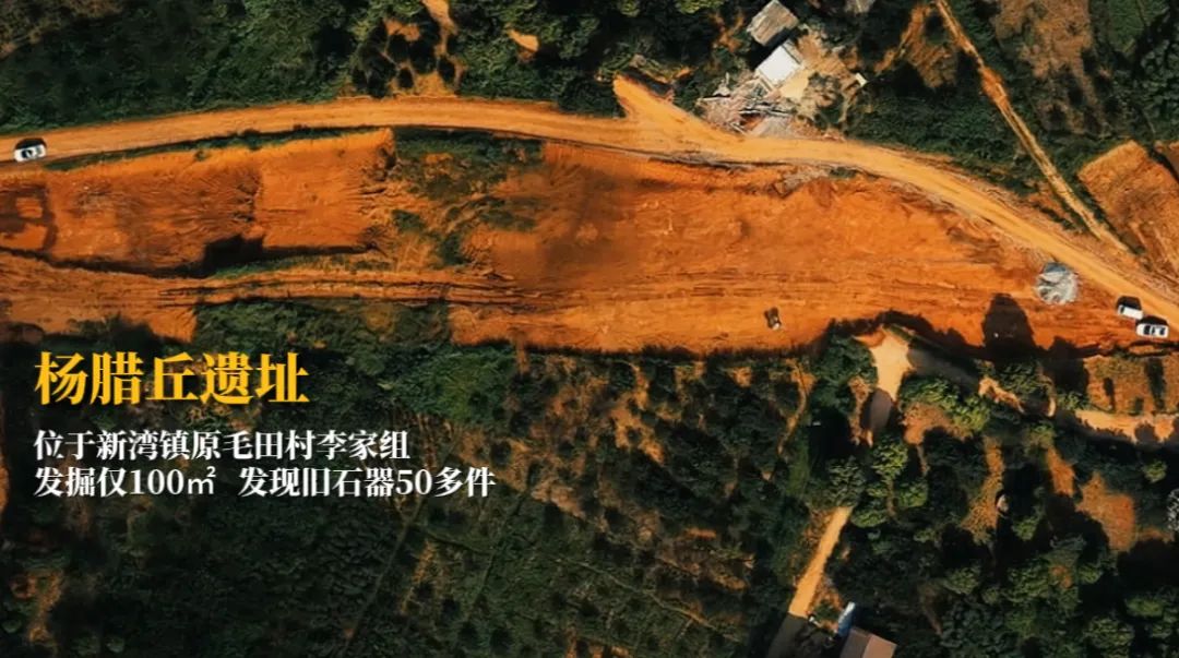 杨腊丘遗址,位于新湾镇原毛田村李家组,发掘仅100㎡,发现旧石器50多件;