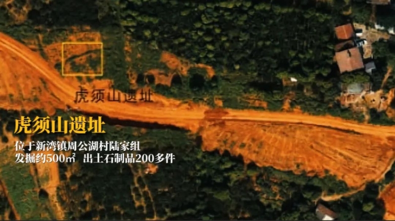 虎须山遗址,位于新湾镇周公湖村陆家组,发掘约500㎡,出土石制品200多件。