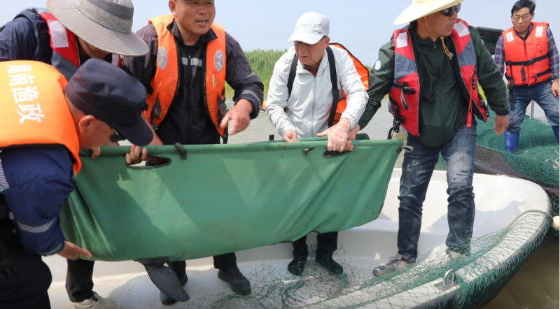 4月29日上午10时许,在沅江市南洞庭湖一处叫做万子湖的水域,随着当地渔政执法人员郑阳春将尾鳍严重受伤的江豚稳稳托入担架,一场持续48小时的生命救援行动圆满落幕。