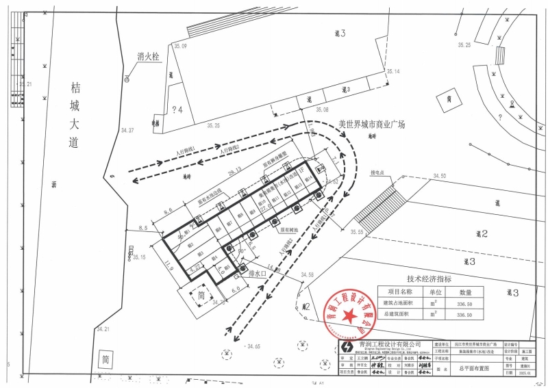 在原广场水池处设置14个模块化集装箱式的临时集市。临时集市为不规则T型,长约47.73米,宽7.1米至15.9米。临时建筑占地面积约340平方米,临时建筑面积约340平方米。