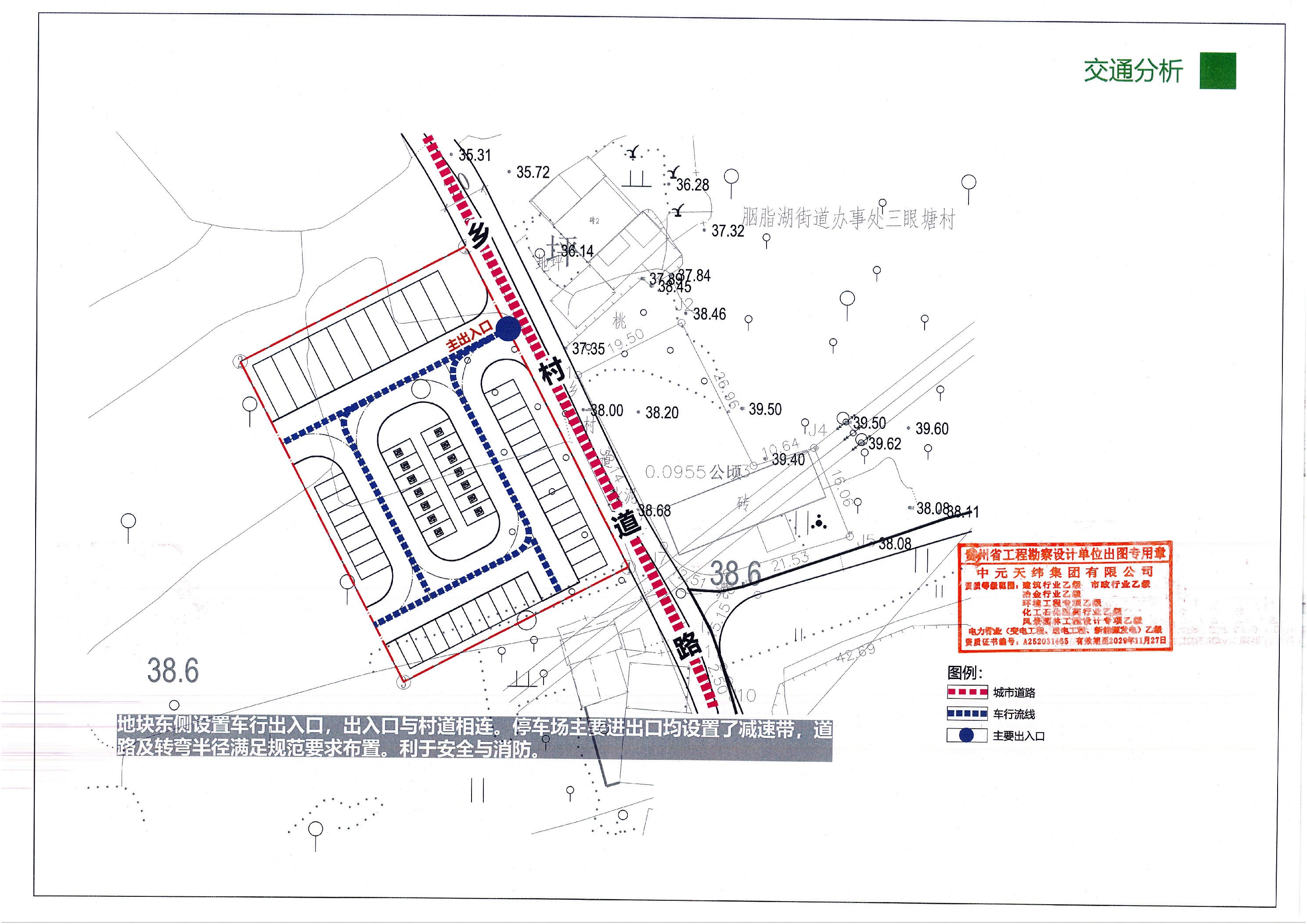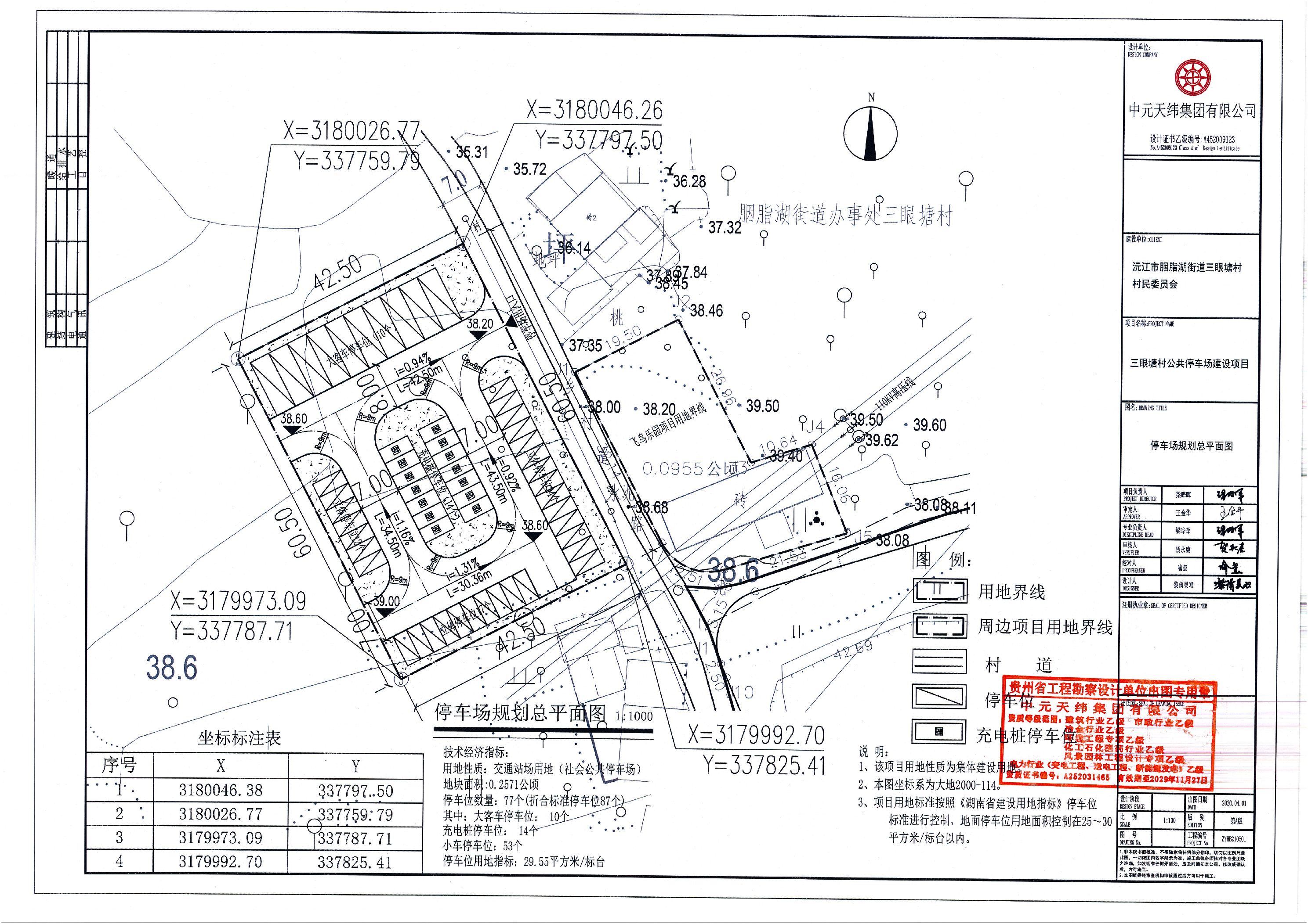 该项目设计方案已经2025年第04期国土空间规划委员会二级专题会审查通过。本项目为地上停车场规划设计,用地范围内分为大客车停车区,充电桩停车区以及普通机动车停车区三大块。功能分区明确,布置合理。项目共设置停车位数量77个(折合标准停车位87个),其中:大客车停车位10个,充电桩停车位14个,小车停车位53个,停车位用地指标29.55m2/标台。在地块东侧设置车行出入口,出入口与村道相连。停车场出入口设置了减速带,道路及转弯半径满足规范要求布置。
