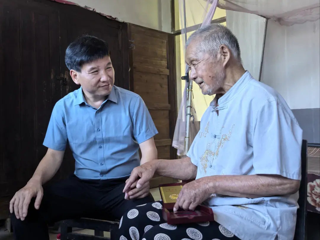 在中国人民抗日战争暨世界反法西斯战争胜利80周年之际,8月19日,沅江市委副书记、市长罗必胜赴胭脂湖街道杨梅山村,走访慰问抗战老兵胡良术,向他致以亲切问候和崇高敬意,并送上由中共中央、国务院、中央军委颁发的“中国人民抗日战争胜利80周年”纪念章。