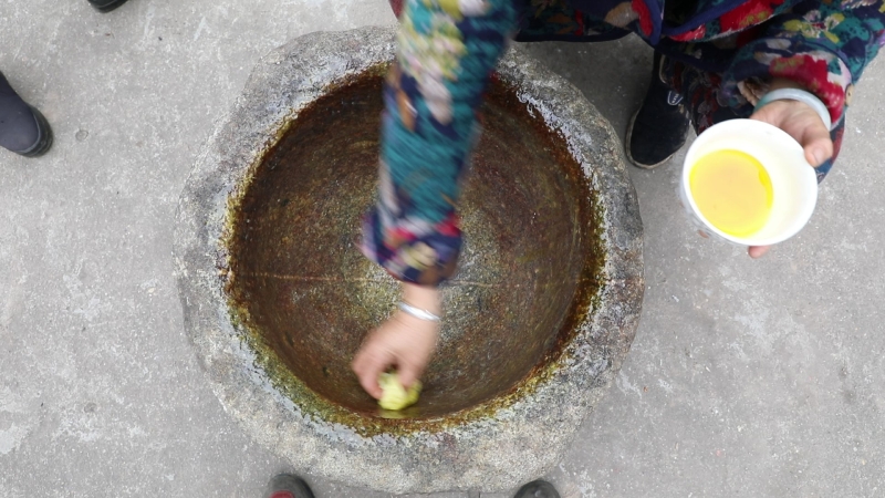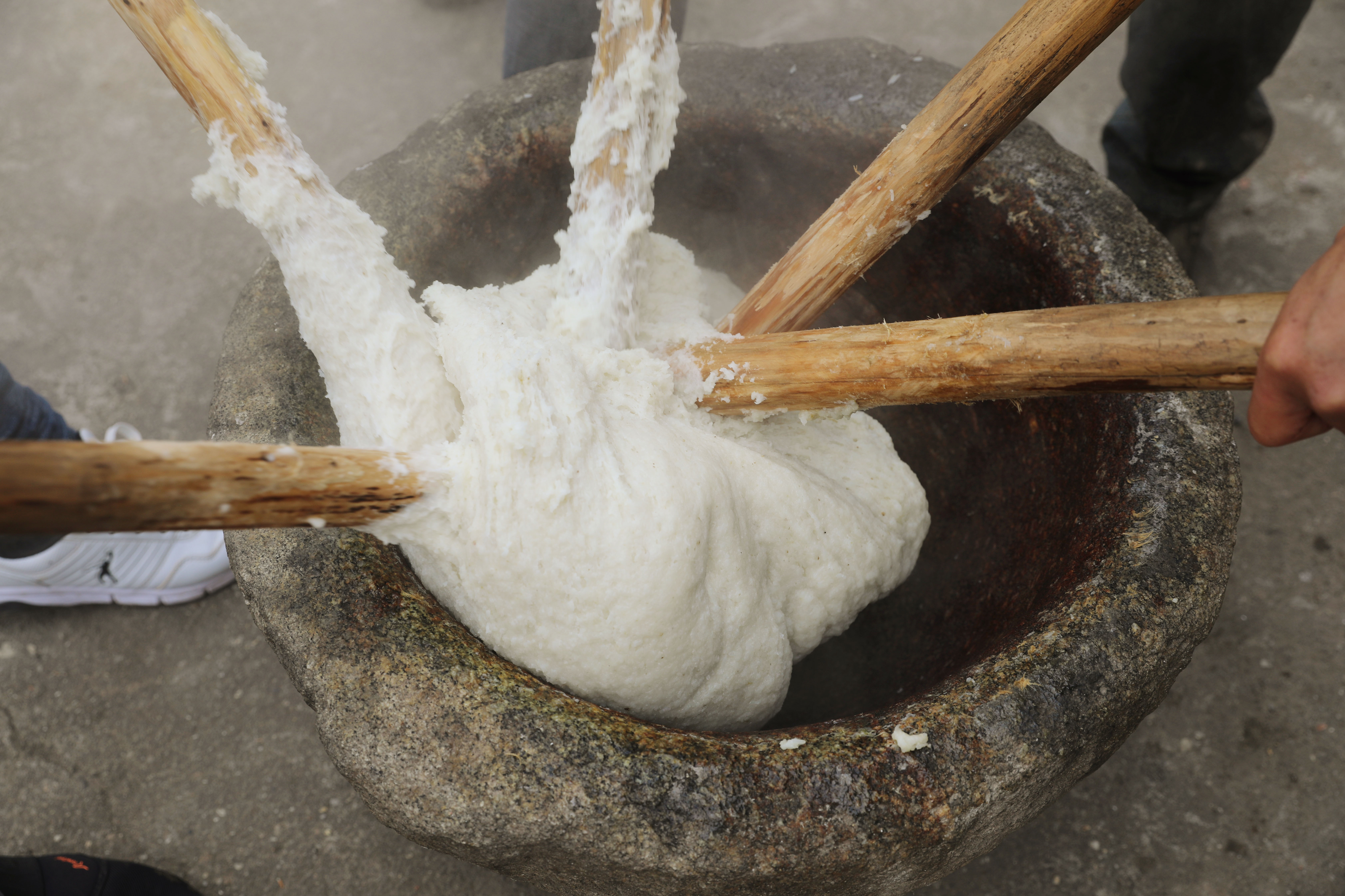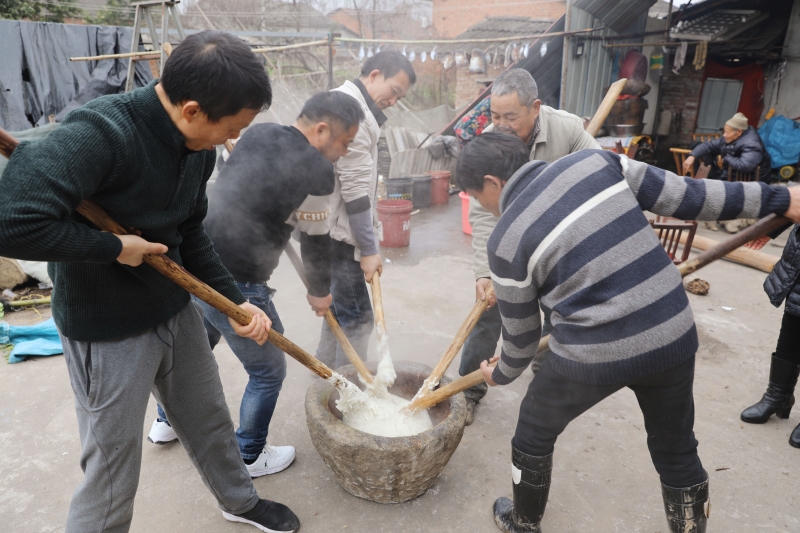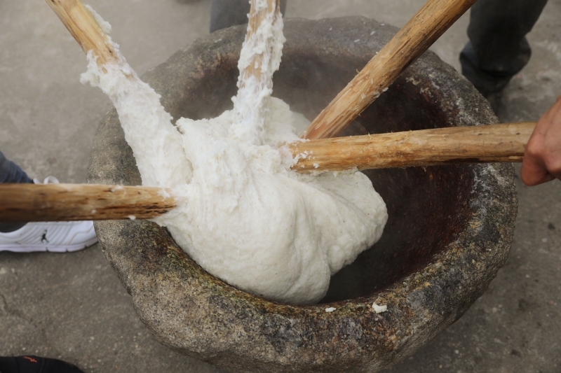 柴火烧灶,噼啪作响。五十分钟后,糯米完全熟透。热气腾腾的糯米饭出笼,清香四溢。米饭倒入碓臼窝子,几个人迅速操起准备好的木棒在碓臼窝子里戳碾。几分钟后,糯米很快碾成了膏状。糯米黏性很强,拉力很大,这需要持棒的几个人用力反复拉起,反复戳碾,动作交错,相互配合。糯米碾成细腻的膏状后,几个人合力转起来,将整团糯米膏撬起,放到事先准备好的桌子上,糯米膏被做成一个大圆饼,象征团圆吉祥,丰收喜庆。