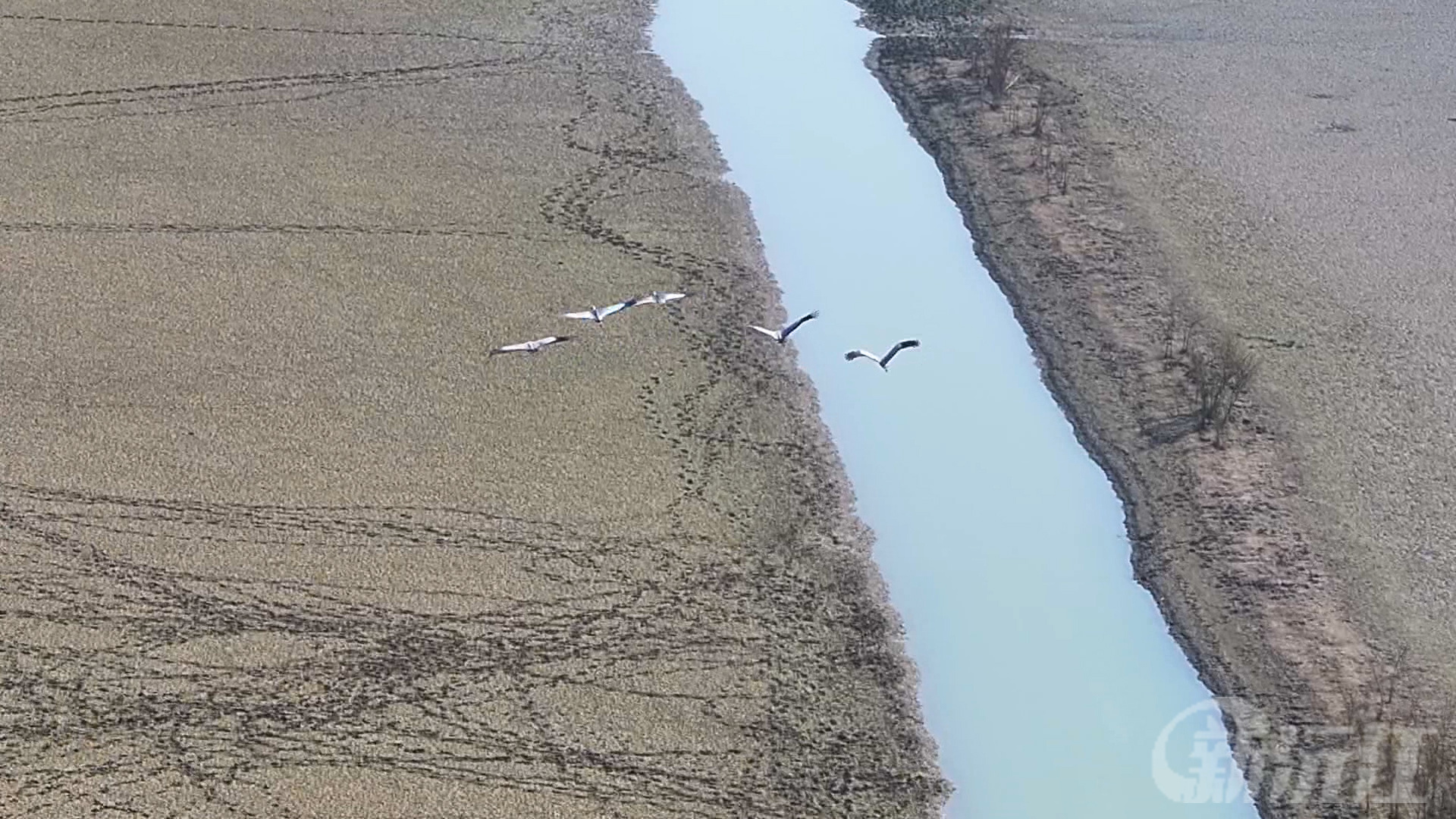 在明山与朗山之间的朗山湖上,两只成年白鹤带着一只幼崽在草丛中觅食;而在生长着旱柳与芦苇的滩涂上,8只白鹤和十多只灰鹤则在悠然地散步,享受着冬日温暖的阳光。而在距离它们不远的一处滩涂上,两只国家一级保护动物白枕鹤轻盈地展翅,飞上湛蓝的天空。白枕鹤在洞庭湖水域偶有记载,但在明朗山这里则是首次记录。