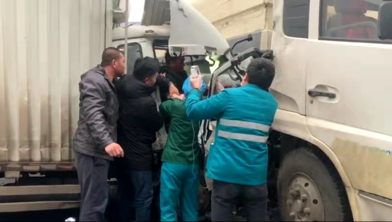消防员到达现场后,发现一台小型货车与另一台大货车相撞,由于撞击力度大,小货车车头已经严重变形,驾驶室有两人被困,且身上多处受伤,被紧紧卡在驾驶室无法动弹,情况十分危急。