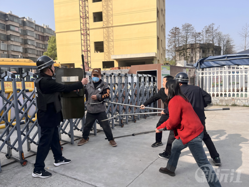 当日演练中,一名扮演“不法分子”的人员在校园门口情绪失控,手持刀具试图强行闯入校园。值班保安发现异常后,第一时间按下一键报警按钮,行政值班人员同步将情况上报园领导。同时,保安迅速拿起钢叉等防暴器械,与“不法分子”周旋。