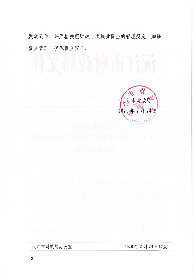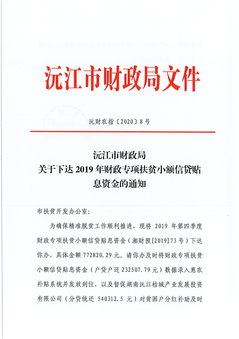 沅江市财政局关于下达2019年财政专项扶贫小额信贷贴息资金的通知 沅财农指[2020]8号