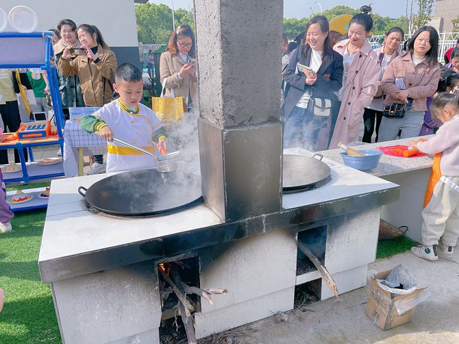 野炊区,大班的孩子们分工合作,热气腾腾。烹饪区的‘小厨神’正卖力地洗着锅,灶膛内柴火苗升得旺旺的;分拣区的‘小刀工’正认真地切着胡萝卜丝……这些娃娃们从选材、洗锅、烧水、添火、烹饪都一一动手,在实际操作中锻炼了动手能力和合作能力。