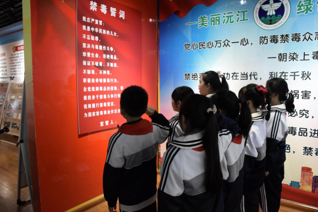 在仿真毒品展区,同学们以更加直观的方式识别毒品,以及各类毒品对身体带来的伤害,纷纷表示要坚决抵制毒品诱惑。听讲解员讲述禁毒先驱林则徐“虎门销烟”的英雄事迹,同学们油然而生一种崇高的敬意。