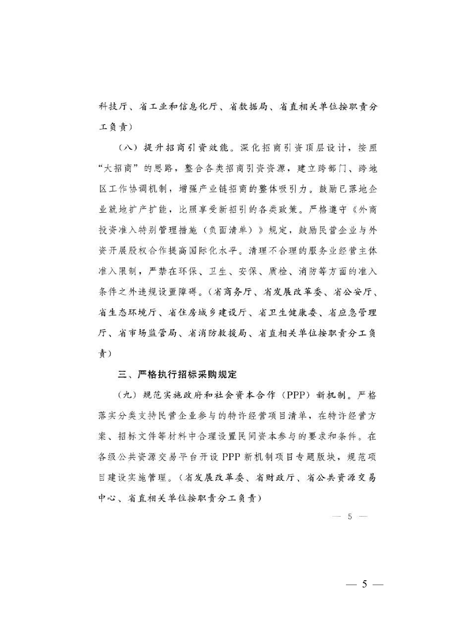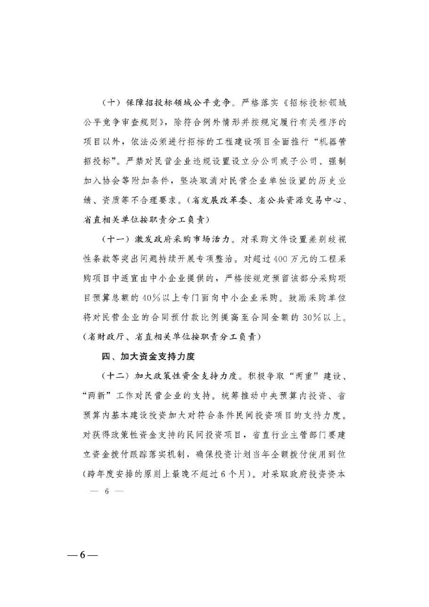 6.切实保障公平竞争。持续清理废除妨碍统一市场和公平竞争的政策文件。持续深化政府采购和招投标领域专项整治,优化完善“机器管招投标”体系,加强标后履约监管与跨部门协同打击,规范市场竞争秩序。(责任单位:省发展改革委、省财政厅、省市场监管局)