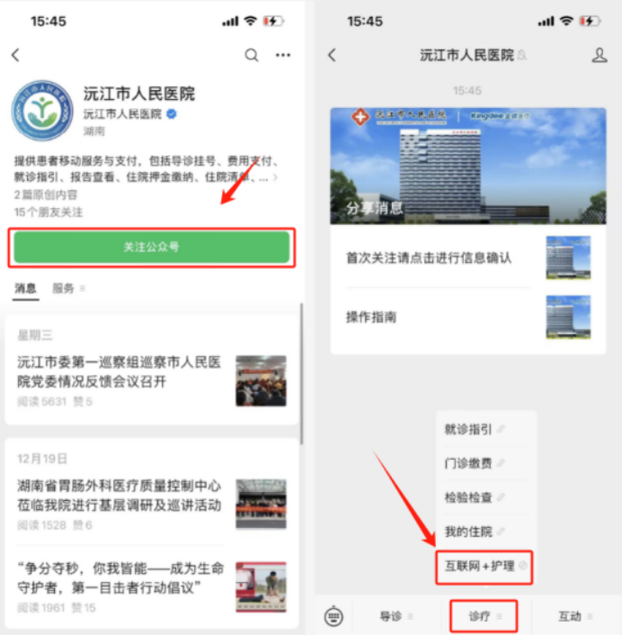 步骤一:微信关注“沅江市人民医院”公众号→点击“诊疗”→“互联网+护理”。
