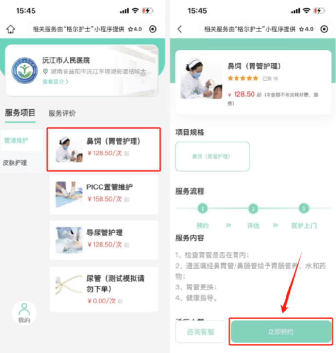 步骤二:依提示进行用户授权后,在打开的“护理平台”页面,选择“您所需要的护理项目”,并点击“立即预约”。