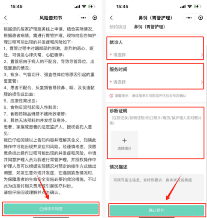 步骤三:阅读“风险告知书”,并点击“已阅读并同意”,后填写服务信息(初次使用,需“新增就诊人”,并按提示填写相关信息),并点击“确认预约”。