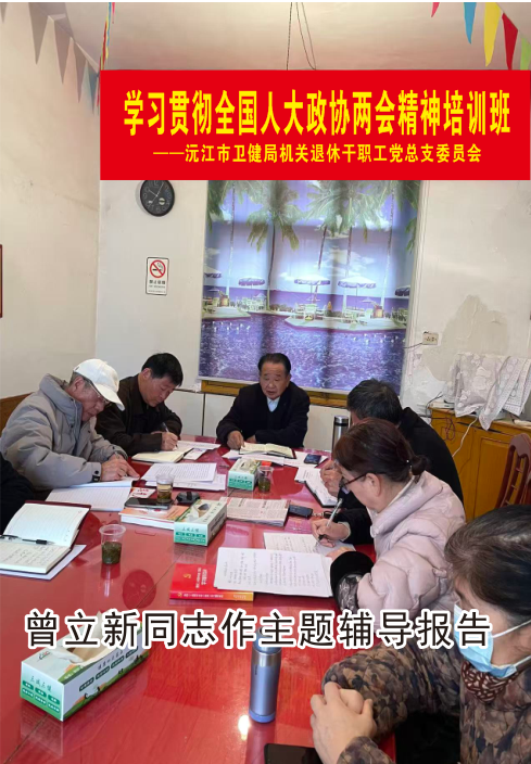 3月21日,沅江市卫生健康局机关退休干部职工党总支委员会结合3月主题党日活动举办学习贯彻全国人大政协两会精神培训班,参加人员为总支、各支部班子成员和老党员代表,培训班由总支副书记郭益辉主持,总支委员张慧同志组织学习两会报导,总支书记曾立新同志作题为:《认真学习贯彻全国两会精神,不断开拓中国式现代化建设新局面》的辅导报告,然后大家进行了讨论,谈感想和体会。会后各党支部将培训班学习内容转达到退休干部职工中。