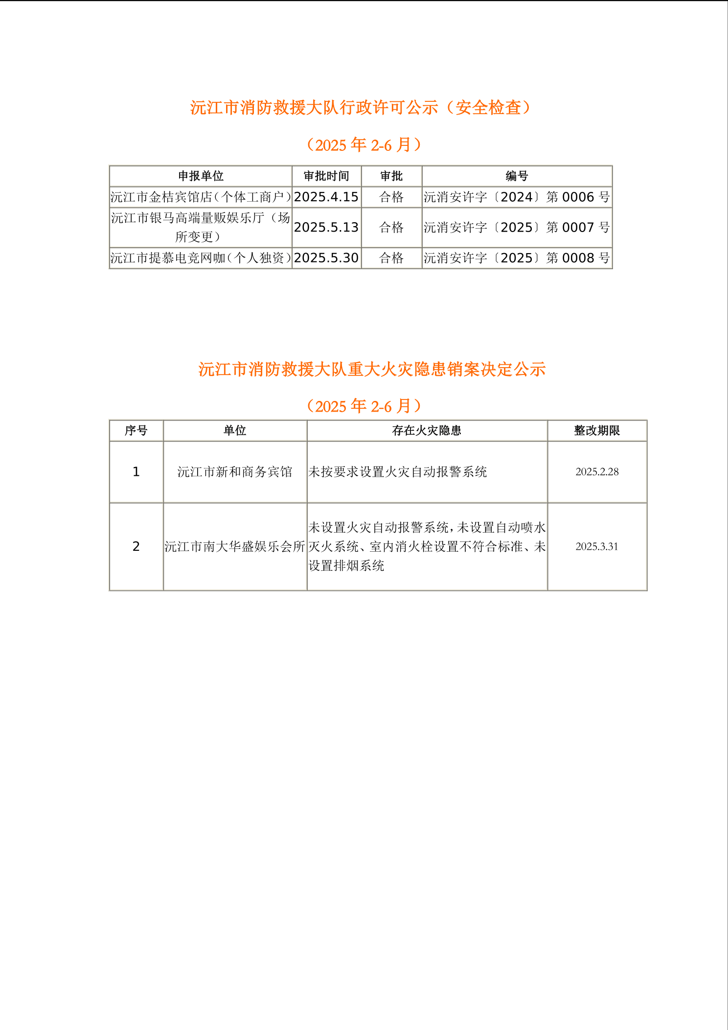 沅江市消防救援大队2025年2-6月行政公示