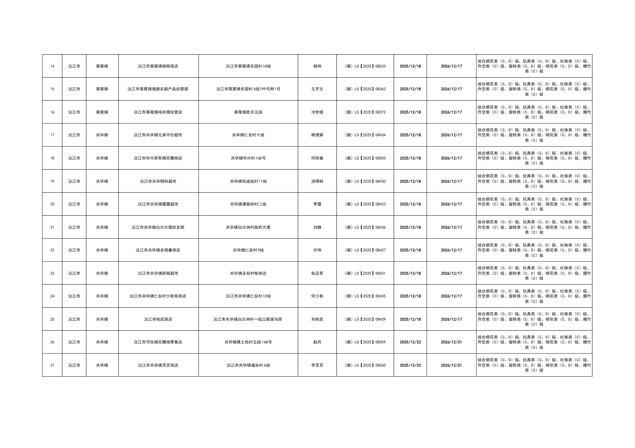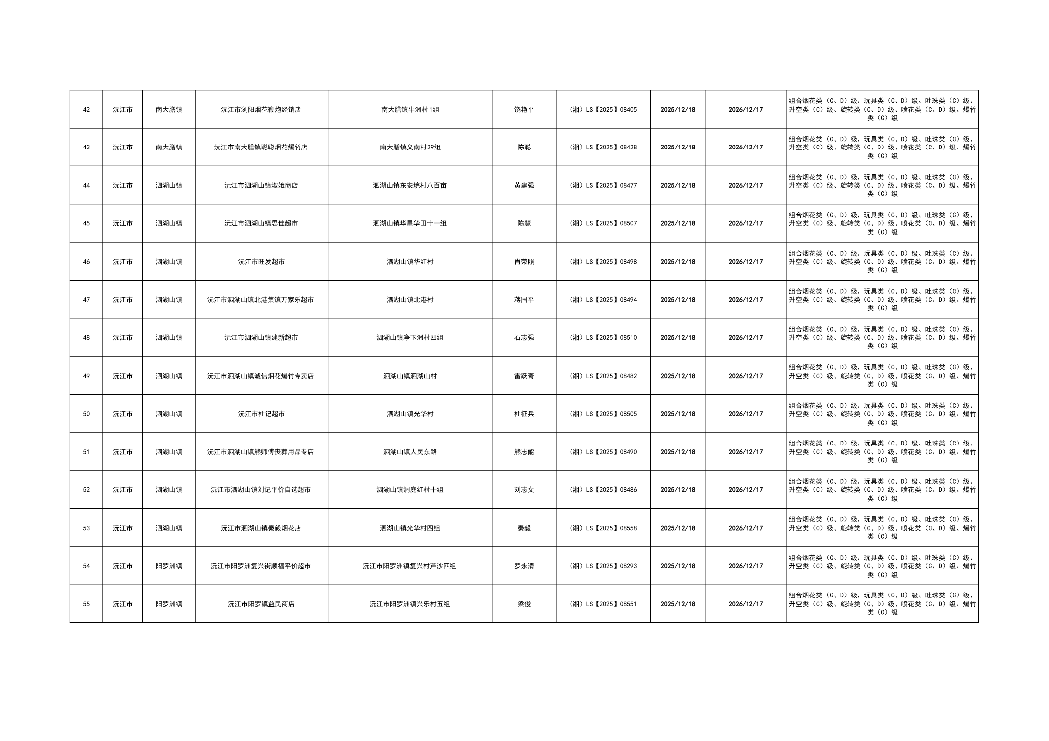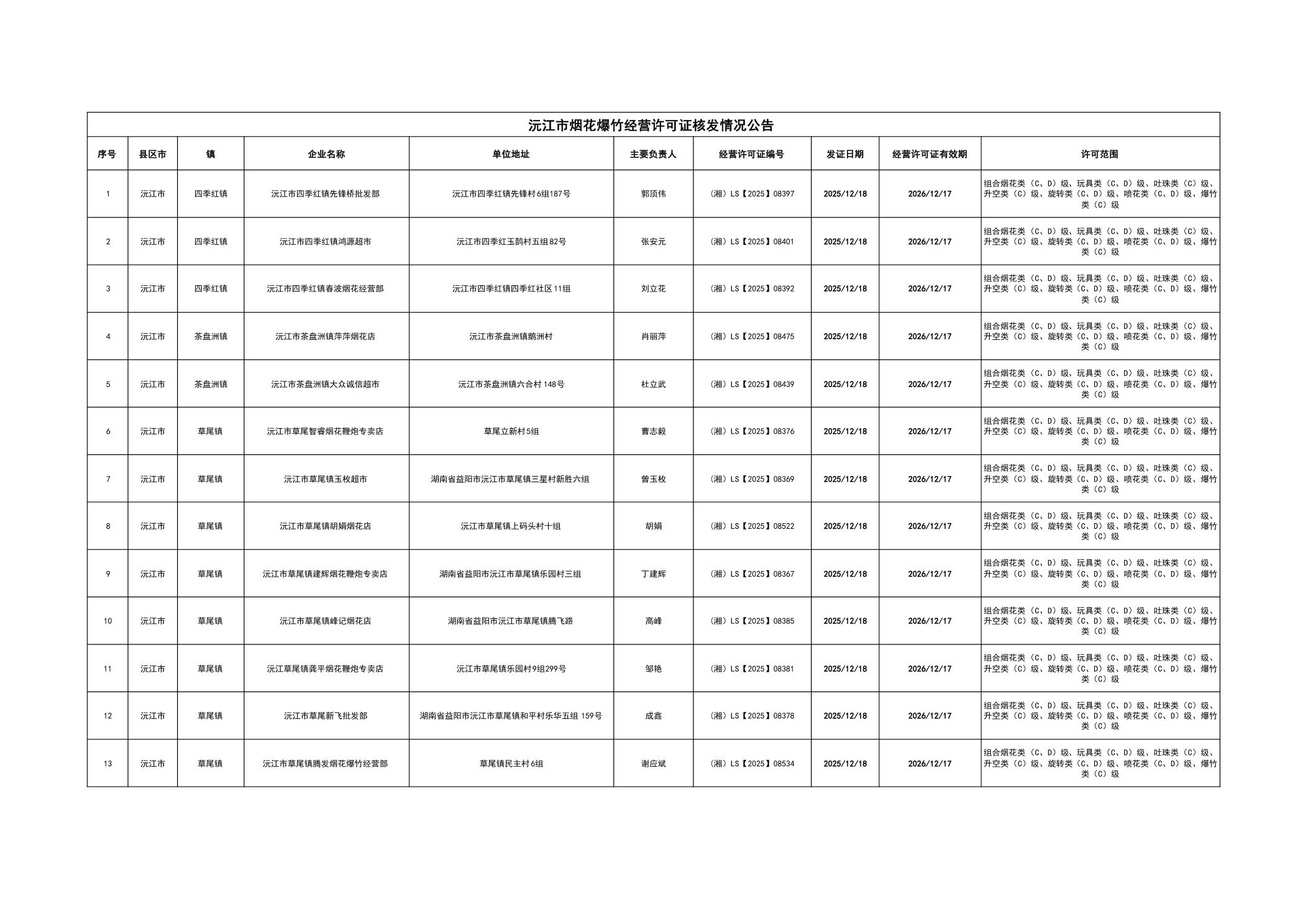 沅江市烟花爆竹经营许可证核发情况公告