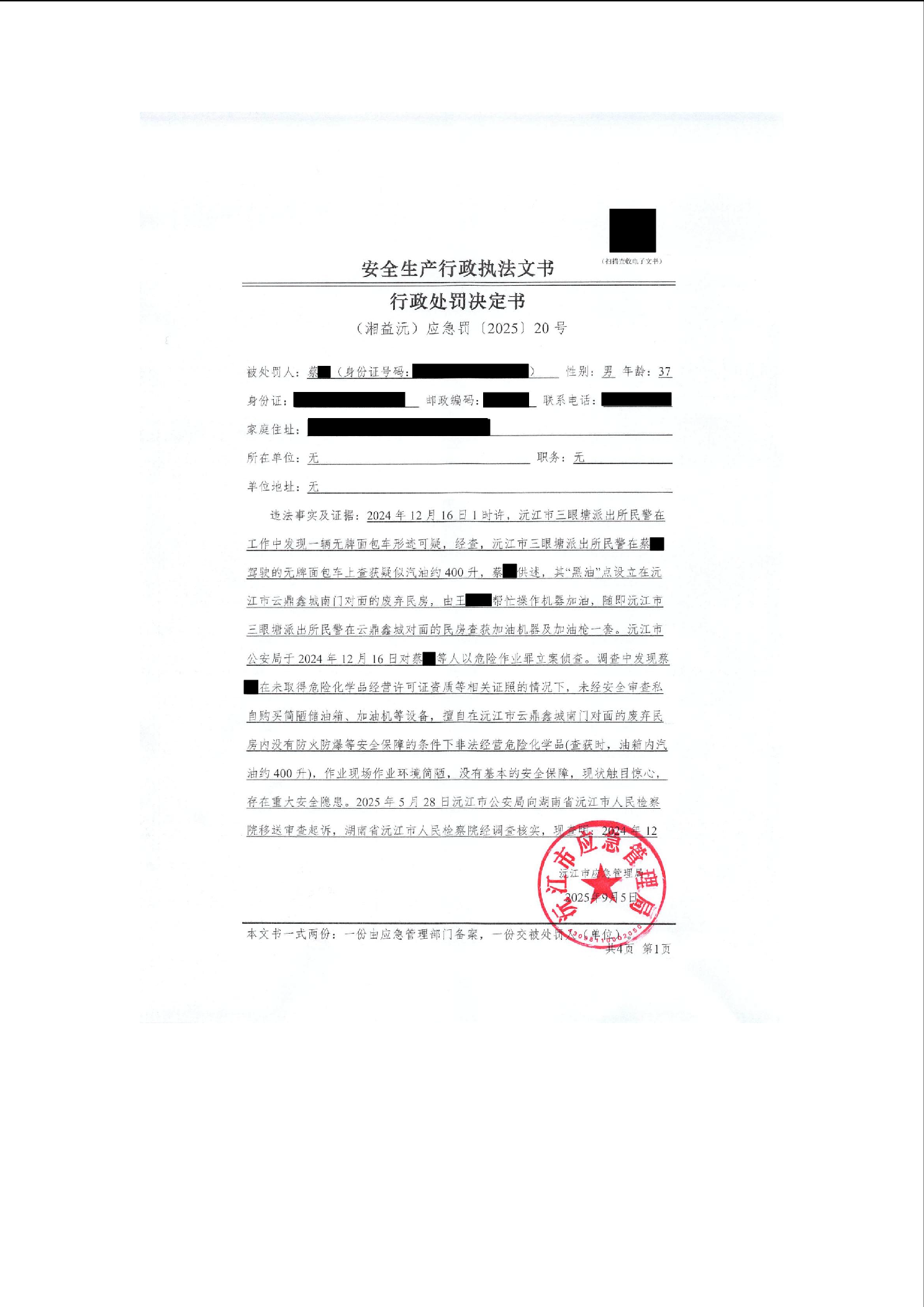 行政处罚决定书公示(湘益沅)应急罚〔2025〕20号