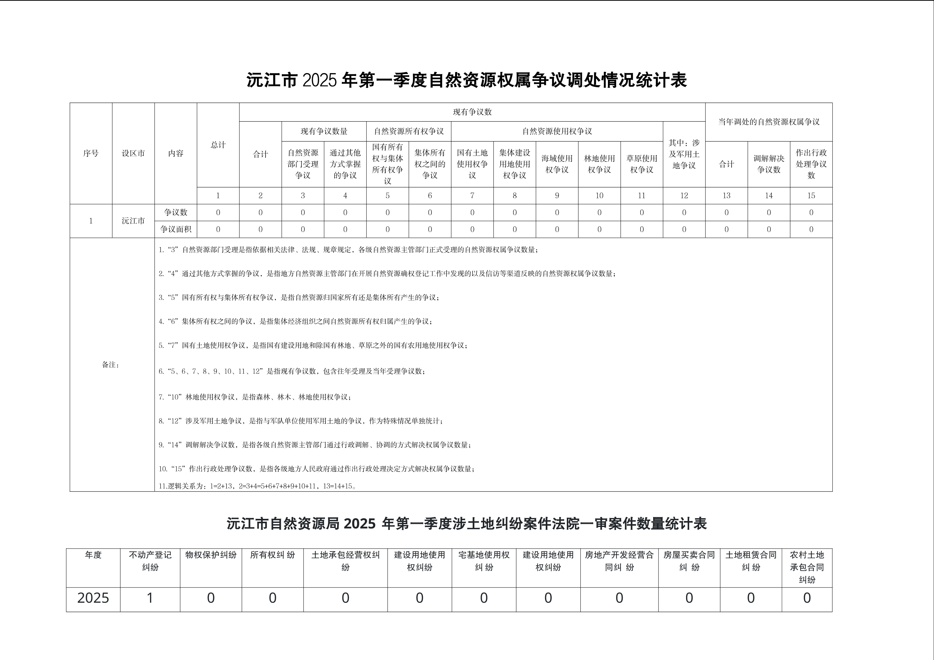 沅江市2025年第一季度自然资源权属争议调处情况及涉土地纠纷案件法院一审案件数量统计表