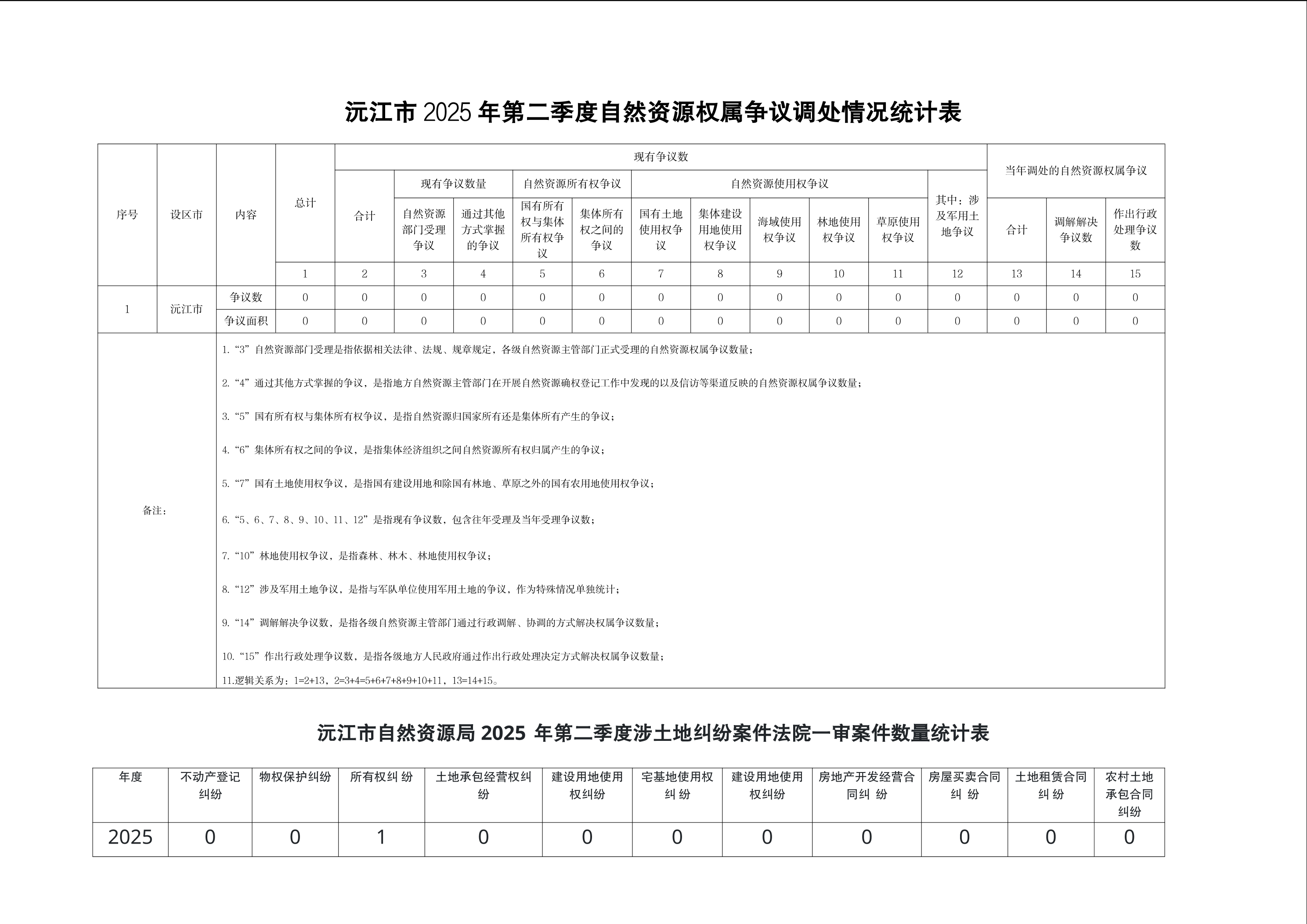 沅江市2025年第二季度自然资源权属争议调处情况及涉土地纠纷案件法院一审案件数量统计表