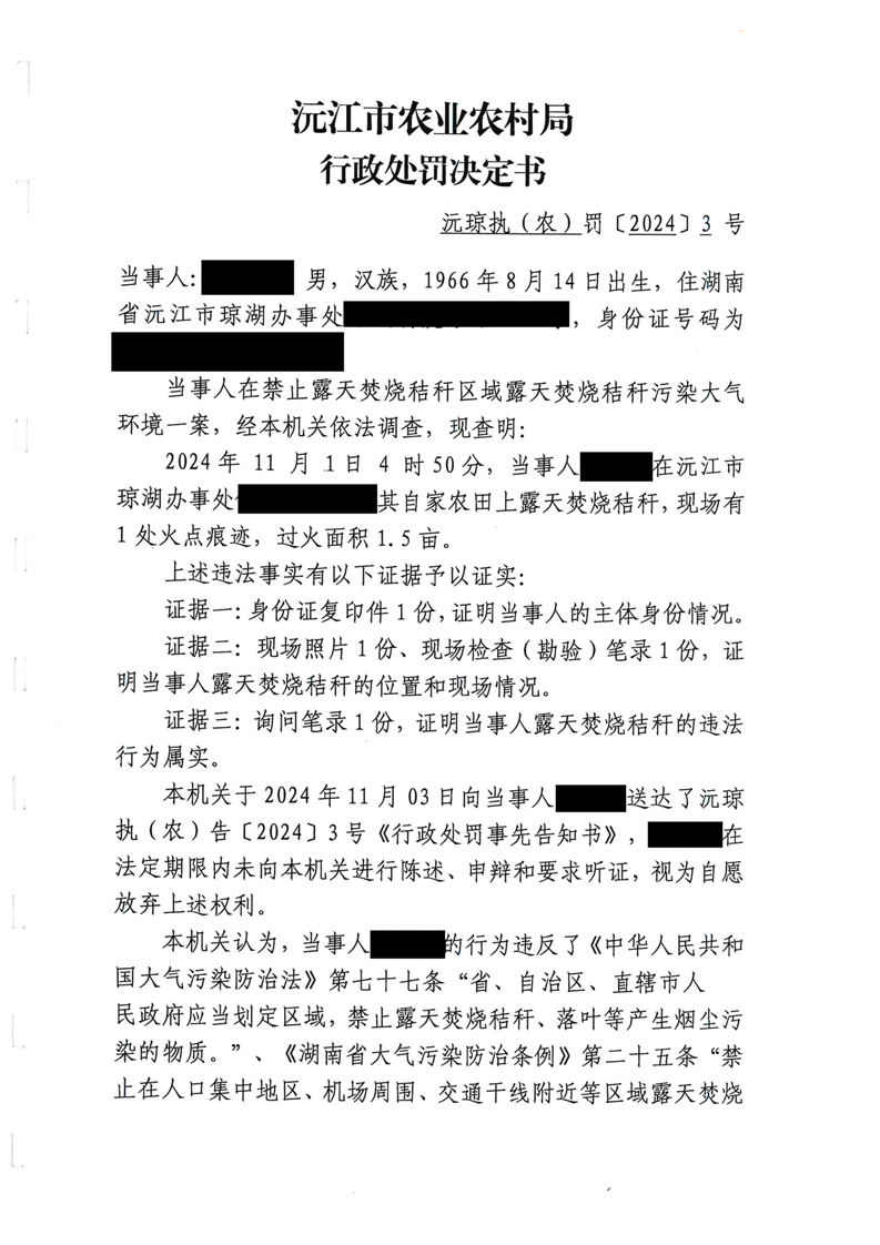 沅琼执(农)罚〔2024〕3号行政处罚决定书