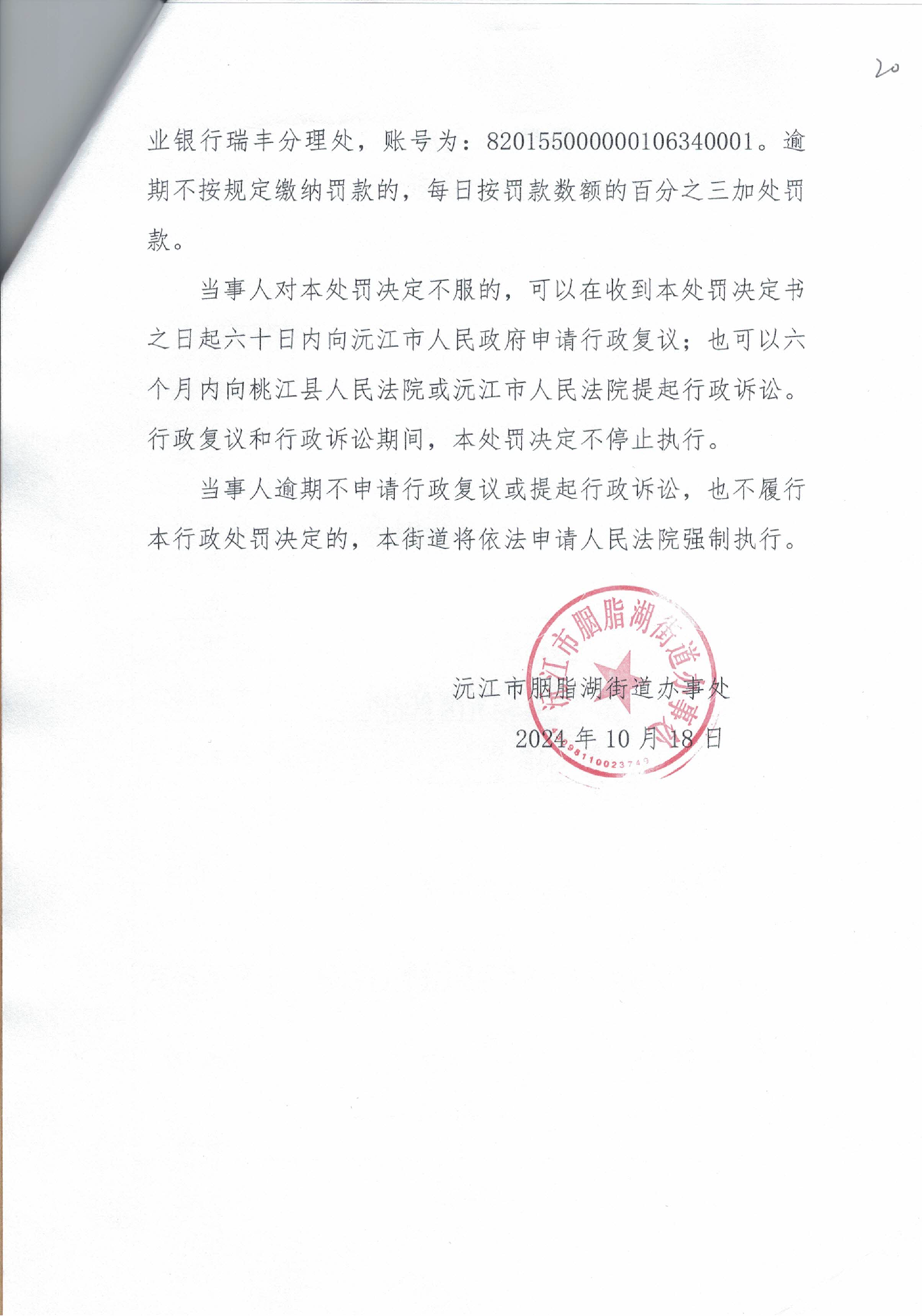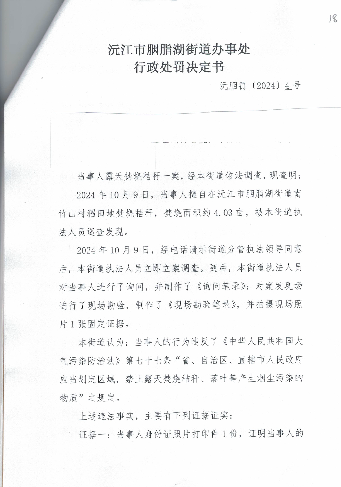沅胭罚[2024]4号行政处罚决定书