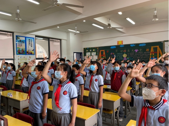 “第一项,升国旗,奏唱国歌,少先队员行队礼,其他人行注目礼……”顿时,雄壮的国歌声在校园里响起,小学部全体师生在教室肃立,注视着教室里的五星红旗,随着音乐高唱国歌。