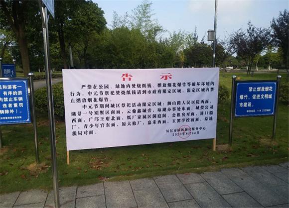 为有效应对和消除中元节烧包、燃放烟花爆竹带来的环境破坏和安全隐患。8月15日以来,市园林绿化服务中心安排专人主动联系公园绿地周边各社区,提前做好今年中元节禁止烧包与燃放烟花爆竹宣传解释工作,积极倡导绿色祭典,文明祭祀。对原埋设墓地相对集中的蓼叶湖公园、郭家湖公园、沅江大道、小叶湖公园及下琼湖公园等地悬挂醒目宣传横幅25条,安装告示牌12块,安排专人值守,积极引导中元祭奠者进行鲜花祭祖,倡导文明行为。