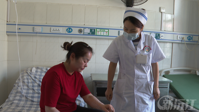 5月12日,何新卫走进患者陈美云的病房,她脚步轻盈,走到床边,动作轻柔地为何美云换好药瓶。之后,她仔细查看陈美云的身体状况,检查手脚是否肿胀,确认无异常后,才轻声嘱咐陈美云注意休息,随后才离开病房。