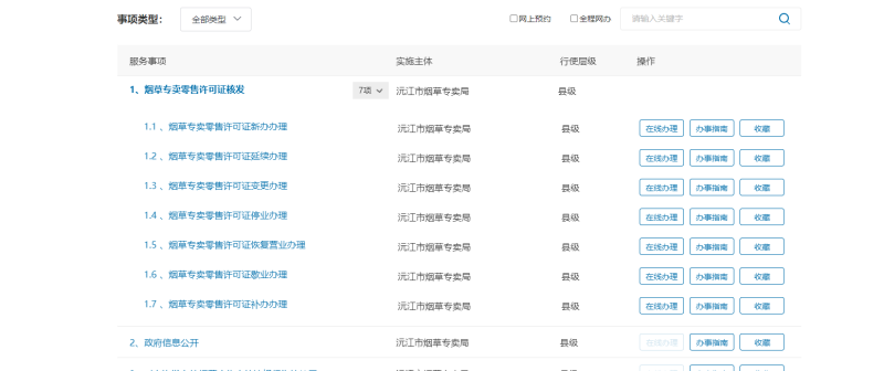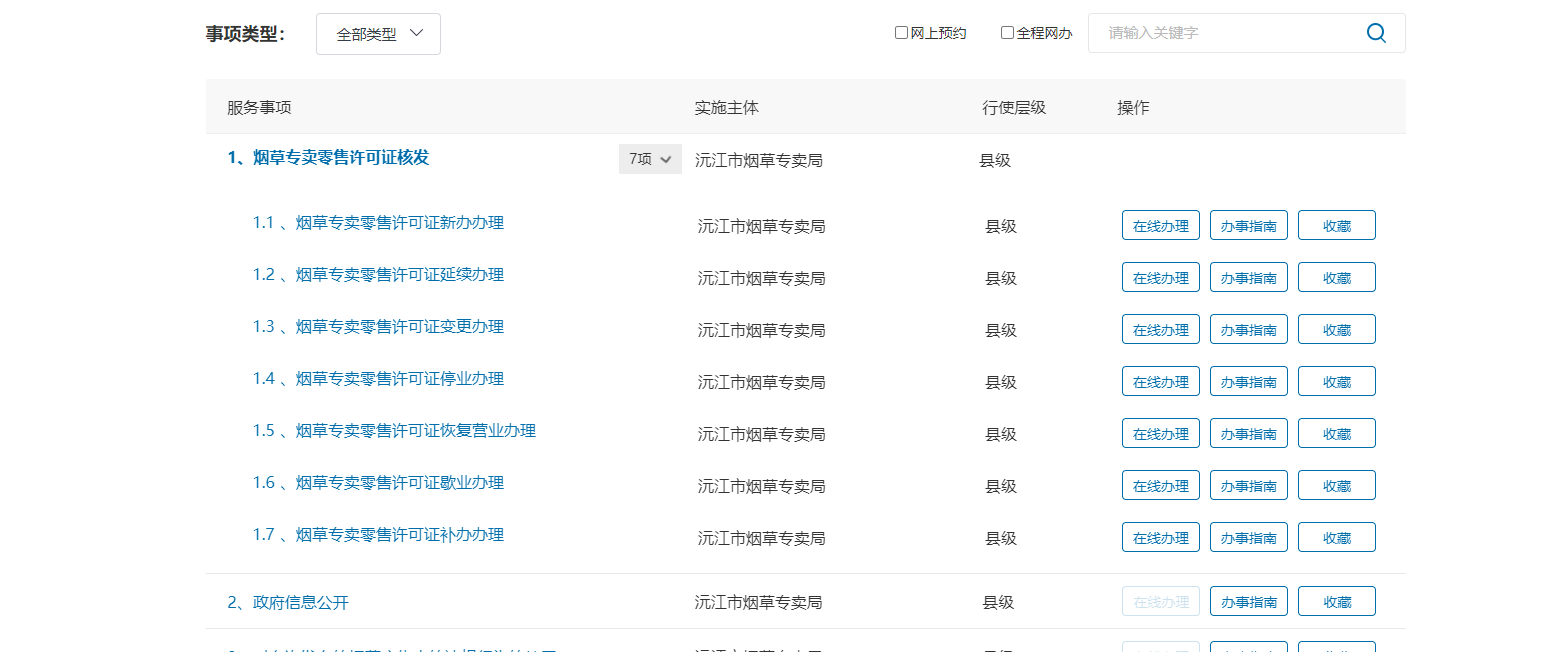 5.登录“湖南省一件事一次办”(http://zwfw-new.hunan.gov.cn)-切换沅江市-烟草专卖局办理烟草证新办、延续、变更、补办、歇业、停业、恢复营业等有关业务。
