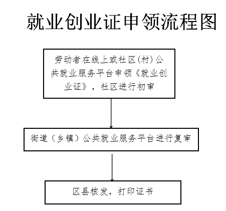 (1)劳动者在线上或社区(村)公 共就业服务平台申领《就业创 ,业证》,社区进行初审 (2)街道(乡镇)公共就业服务平台进行复审(3)区县核发,打印证书 |