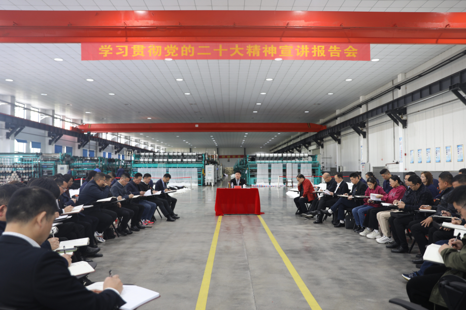 在鑫海无结网车间,杨智勇重点围绕党的二十大的主题内容,中国式现代化的发展过程、显著特点、首要原则以及构建高水平社会主义市场经济体制,建设现代化产业体系,完善科技创新体系,加快实施创新驱动发展战略等方面做了深入浅出的宣讲。他指出,党的二十大是一次高举旗帜、凝聚力量、团结奋进的大会,在党和国家历史上具有里程碑意义,其中科学的理论令人清醒,伟大的变革令人自豪,巨大的成就令人骄傲,时代的重任令人振奋,光明的未来令人向往,人民的力量令人鼓舞,领袖的情怀令人爱戴,中国的精神令人感动。各企业要深刻领会党的二十大的重大理论意义、现实意义、历史意义,准确把握党的二十大精神实质,切实用大会精神武装头脑、指导实践、推动工作,紧密结合工作实际,找准工业现代化的切入点和突破口,全面推动企业发展,融入和支撑中国式现代化,努力为实现第二个百年奋斗目标作出应有贡献。