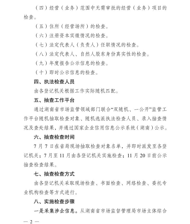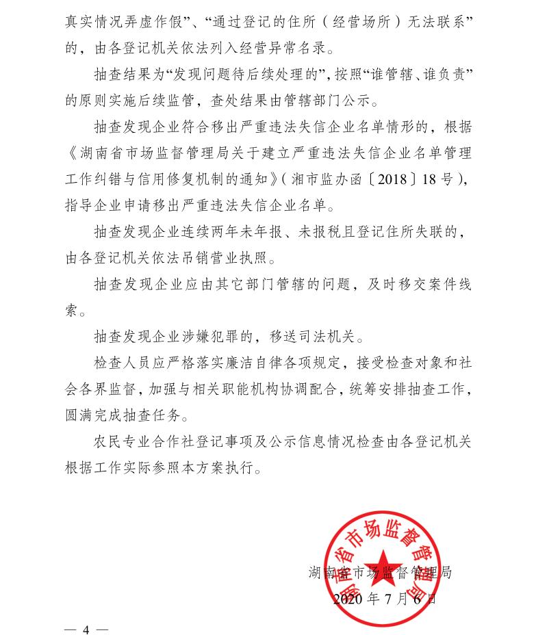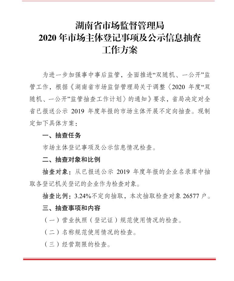 湖南省市场监督管理局2020年市场主体登记事项及公示信息抽查工作方案