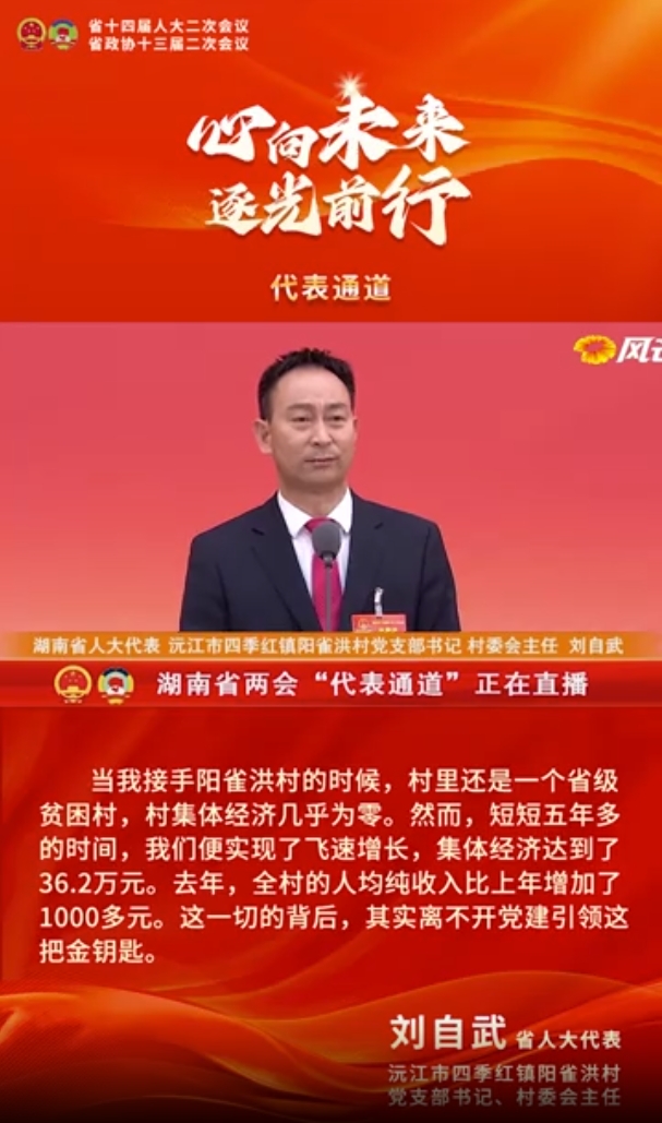 “一个省级贫困村,村集体经济几乎为零。然而,仅仅五年多的时间,便实现了飞速增长,达到了36.2万元。去年,全村的人均纯收入比上年增加了1000元。这一切的背后,都离不开党建引领这把金钥匙。”1月24日,在省十四届人大二次会议第一场“代表通道”上,省人大代表,沅江市四季红镇阳雀洪村党支部书记、村委会主任刘自武分享了阳雀洪村从省级贫困村发展为乡村振兴示范村的故事。