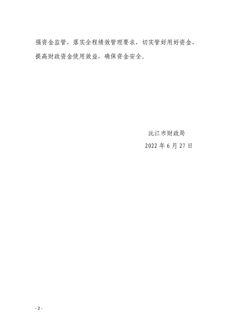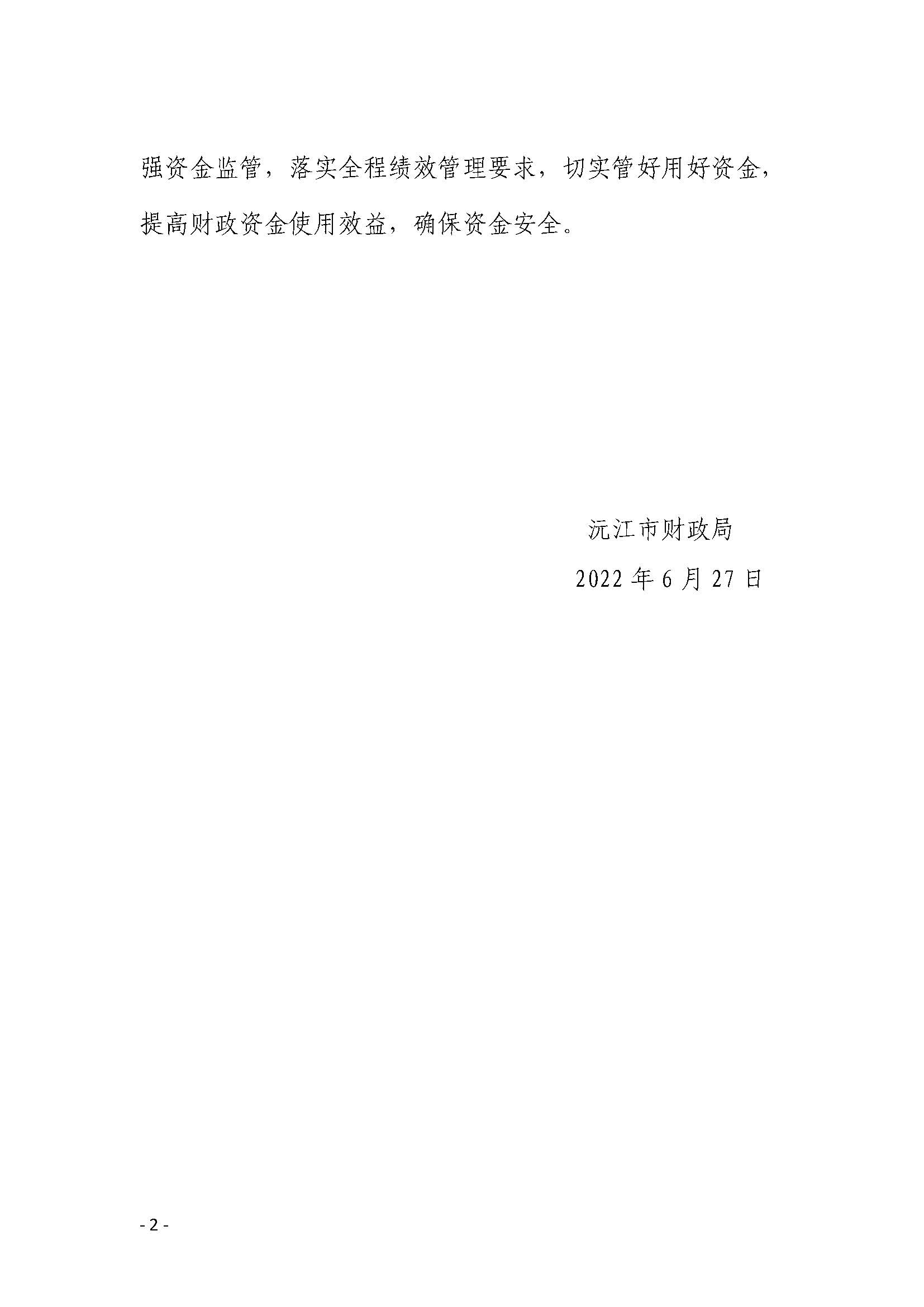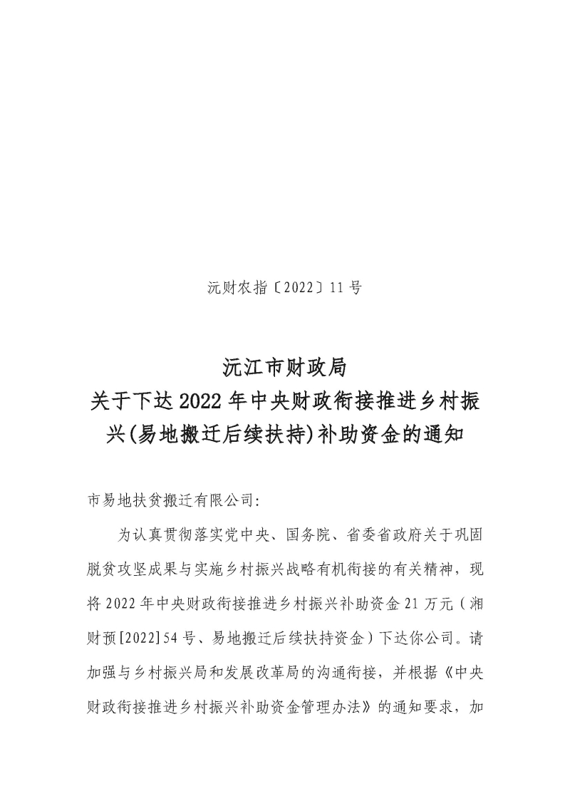 沅财农指〔2022〕11号 关于下达2022年中央财政衔接推进乡村振兴(易地搬迁后续扶持)补助资金的通知
