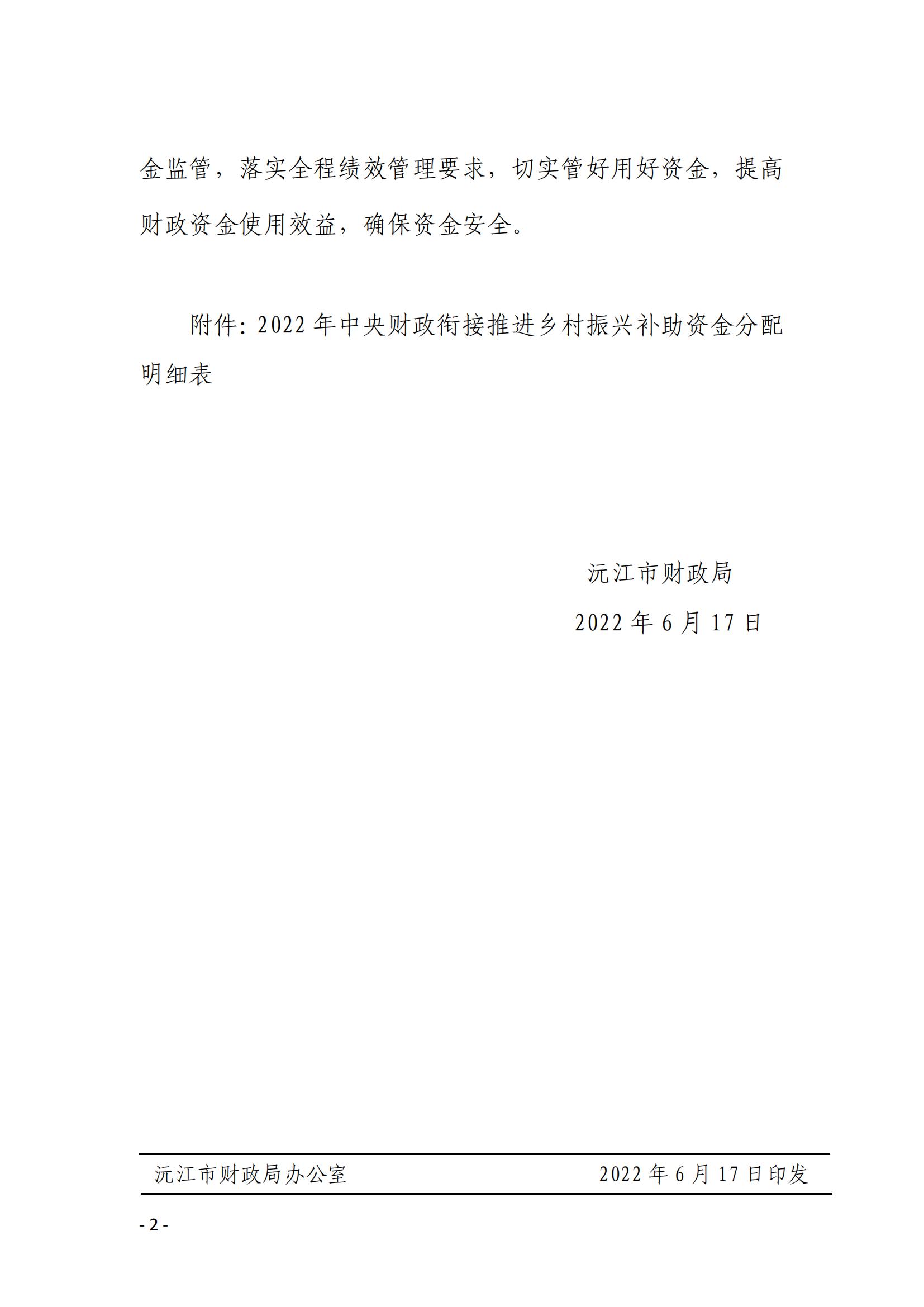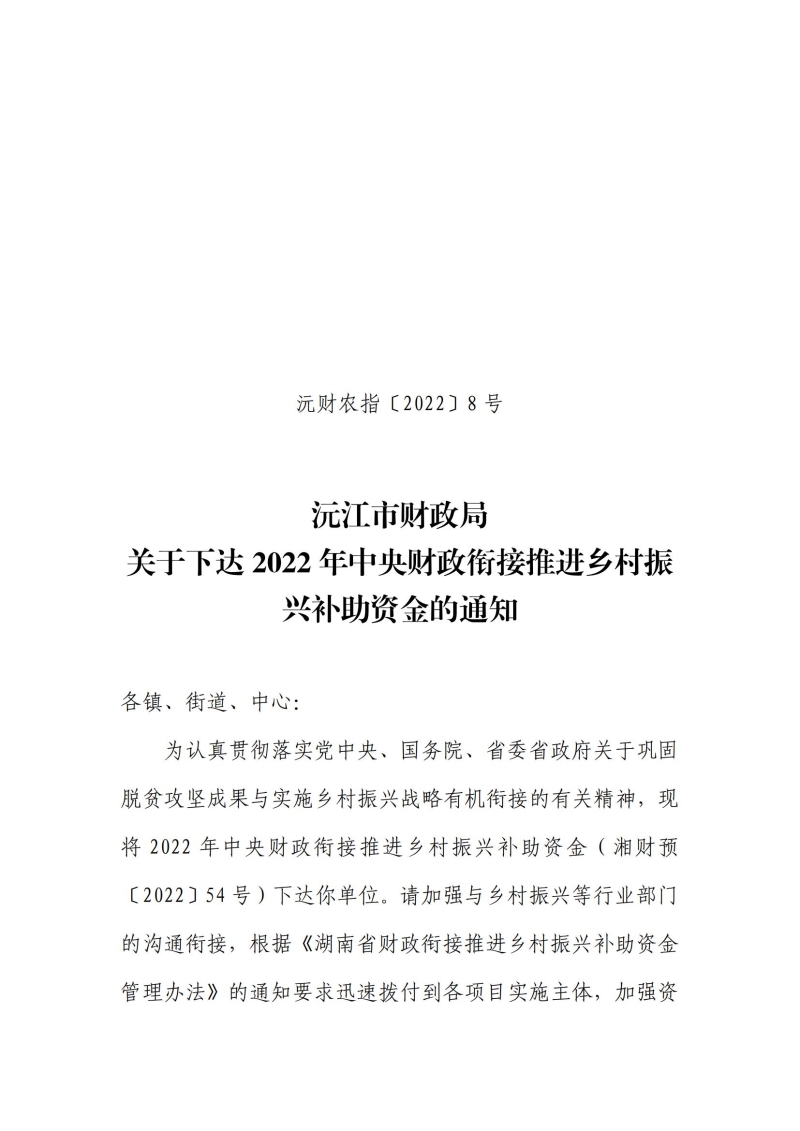 沅财农指〔2022〕8号 沅江市财政局关于下达2022年中央财政衔接推进乡村振兴补助资金的通知