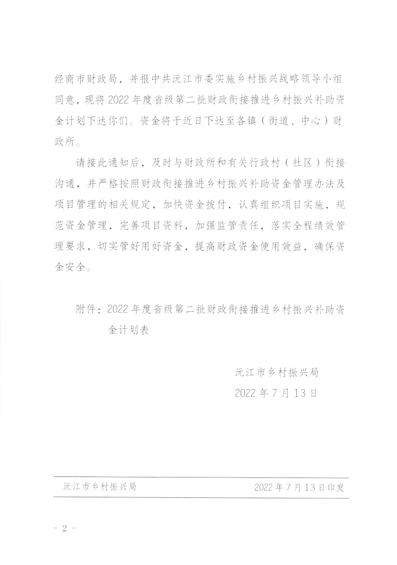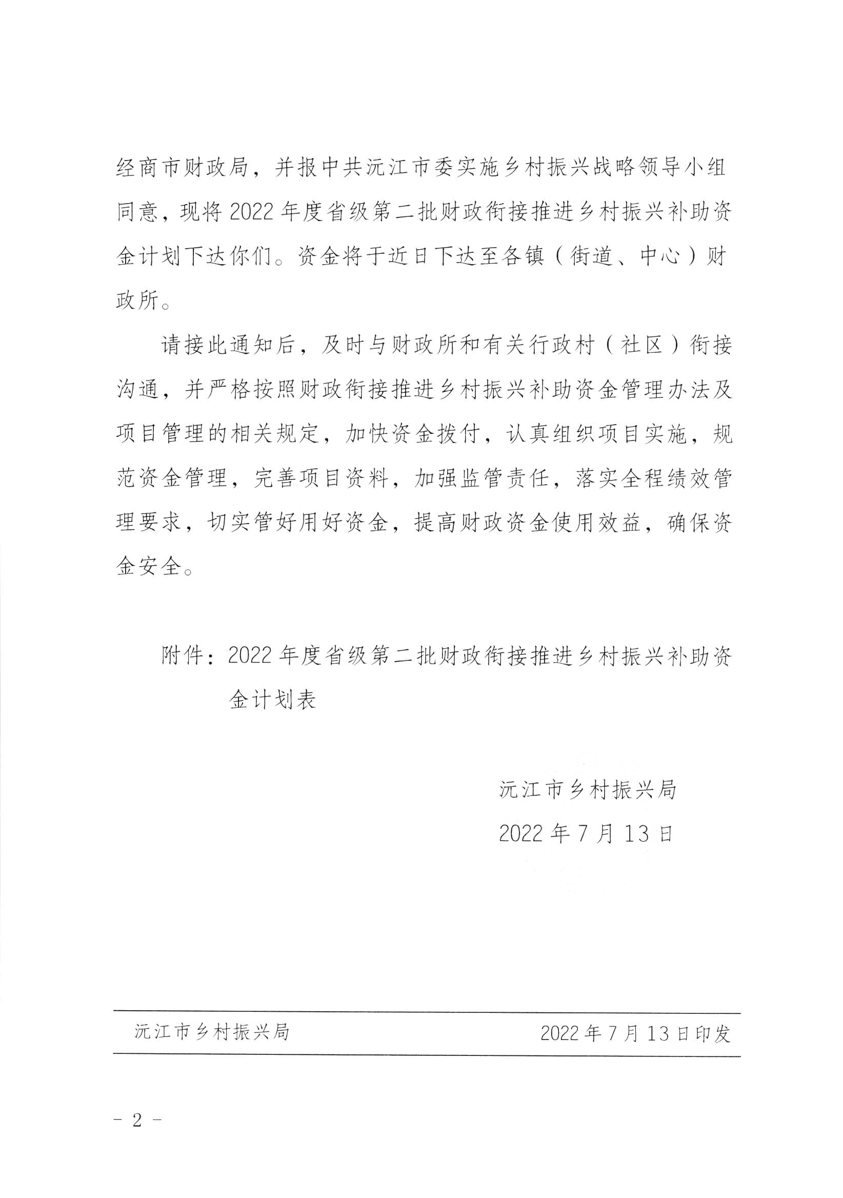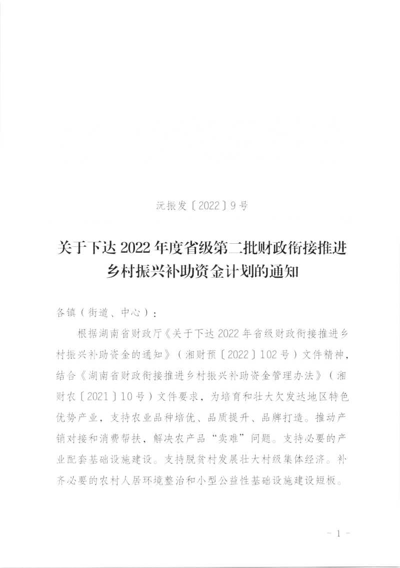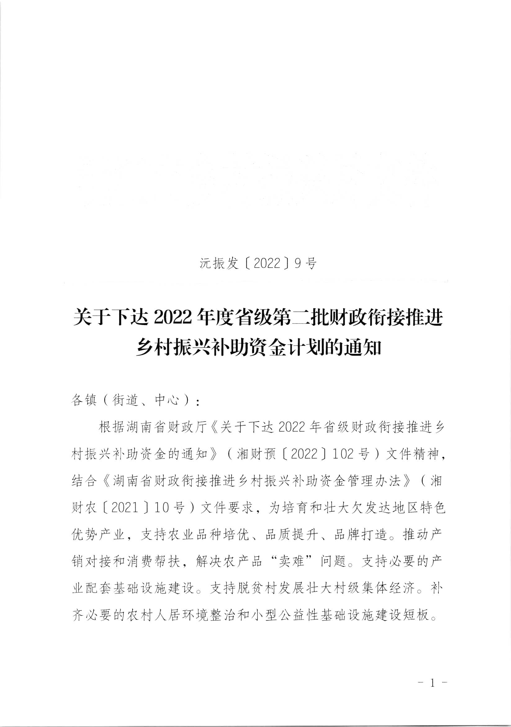 沅振发〔2022〕9号 关于下达2022年度省级第二批财政衔接推进乡村振兴补助资金计划的通知