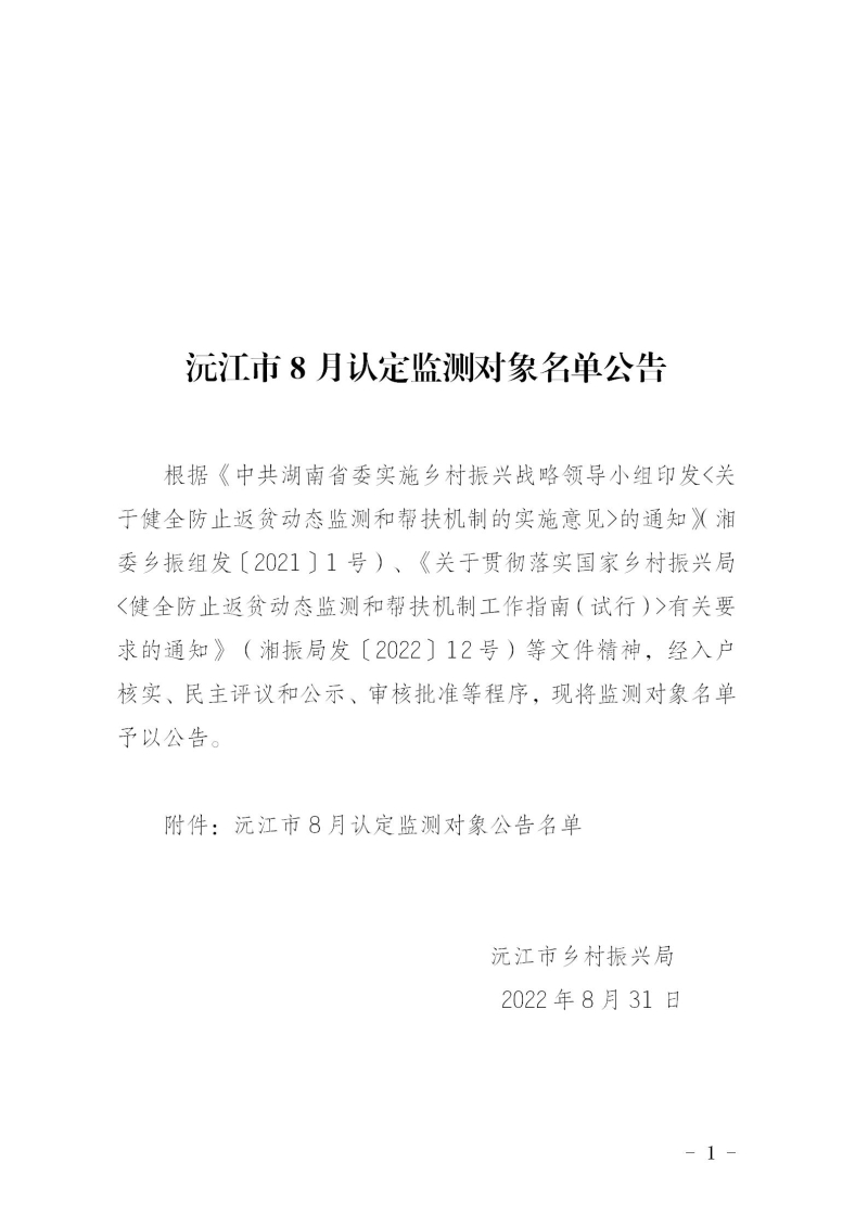沅江市8月认定监测对象名单公告