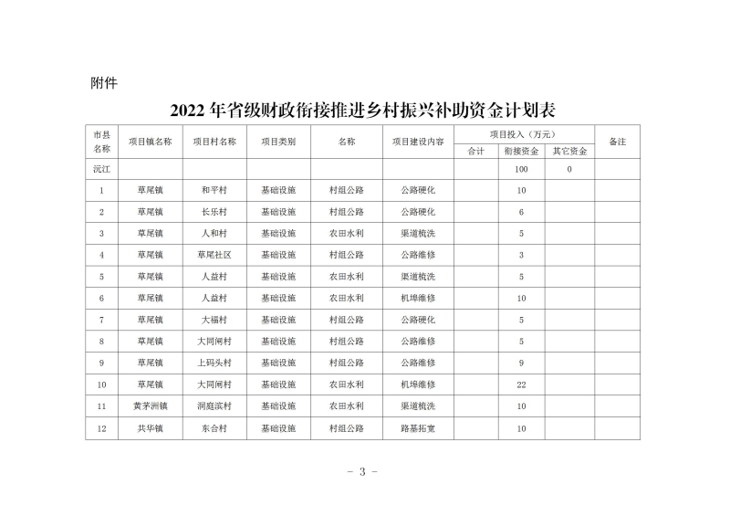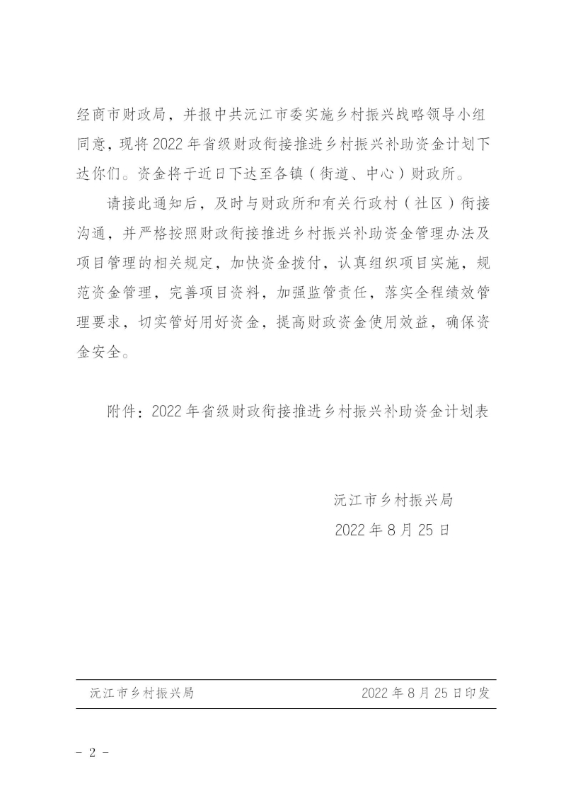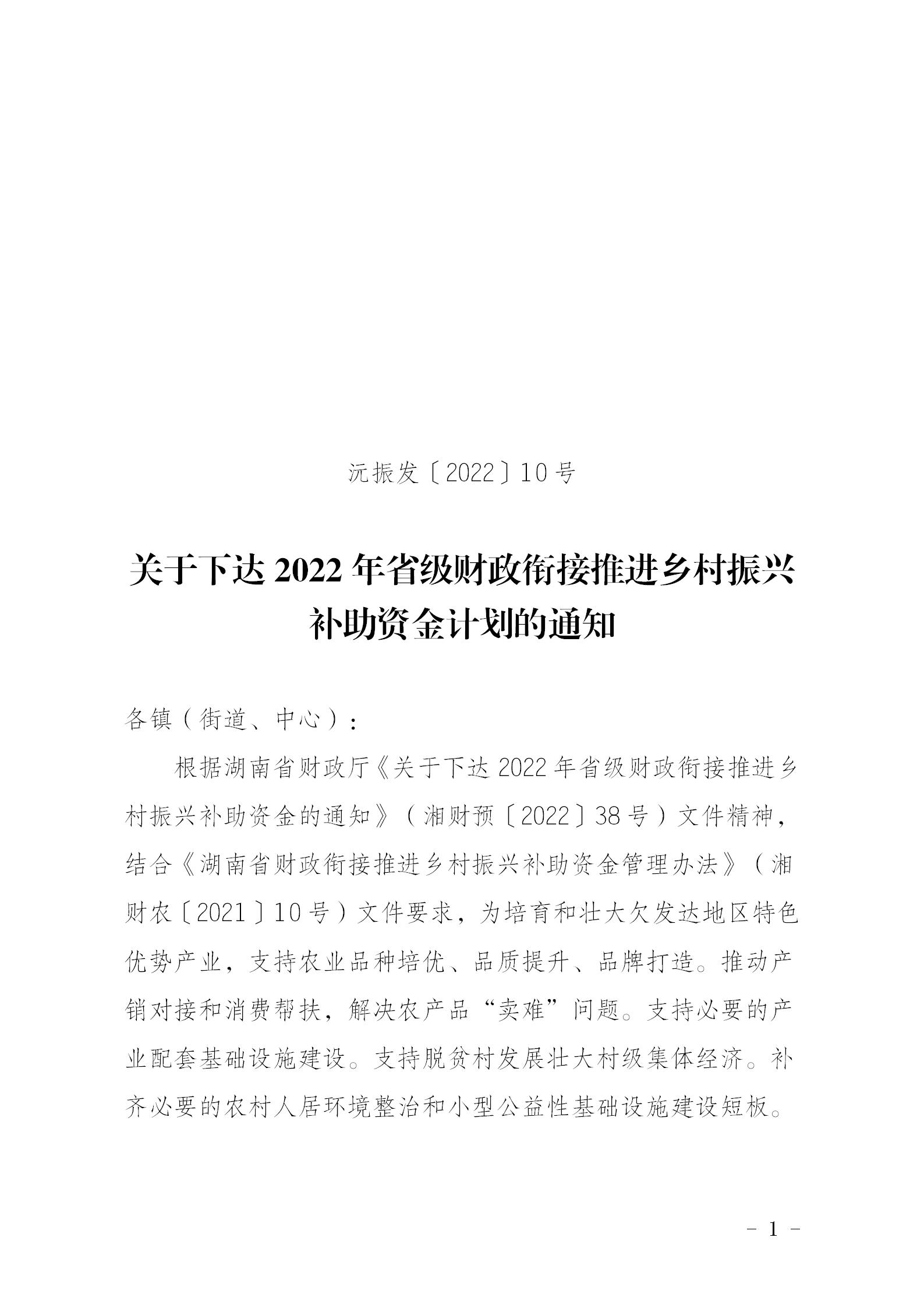 沅振发〔2022〕10号 关于下达2022年省级财政衔接推进乡村振兴补助资金计划的通知