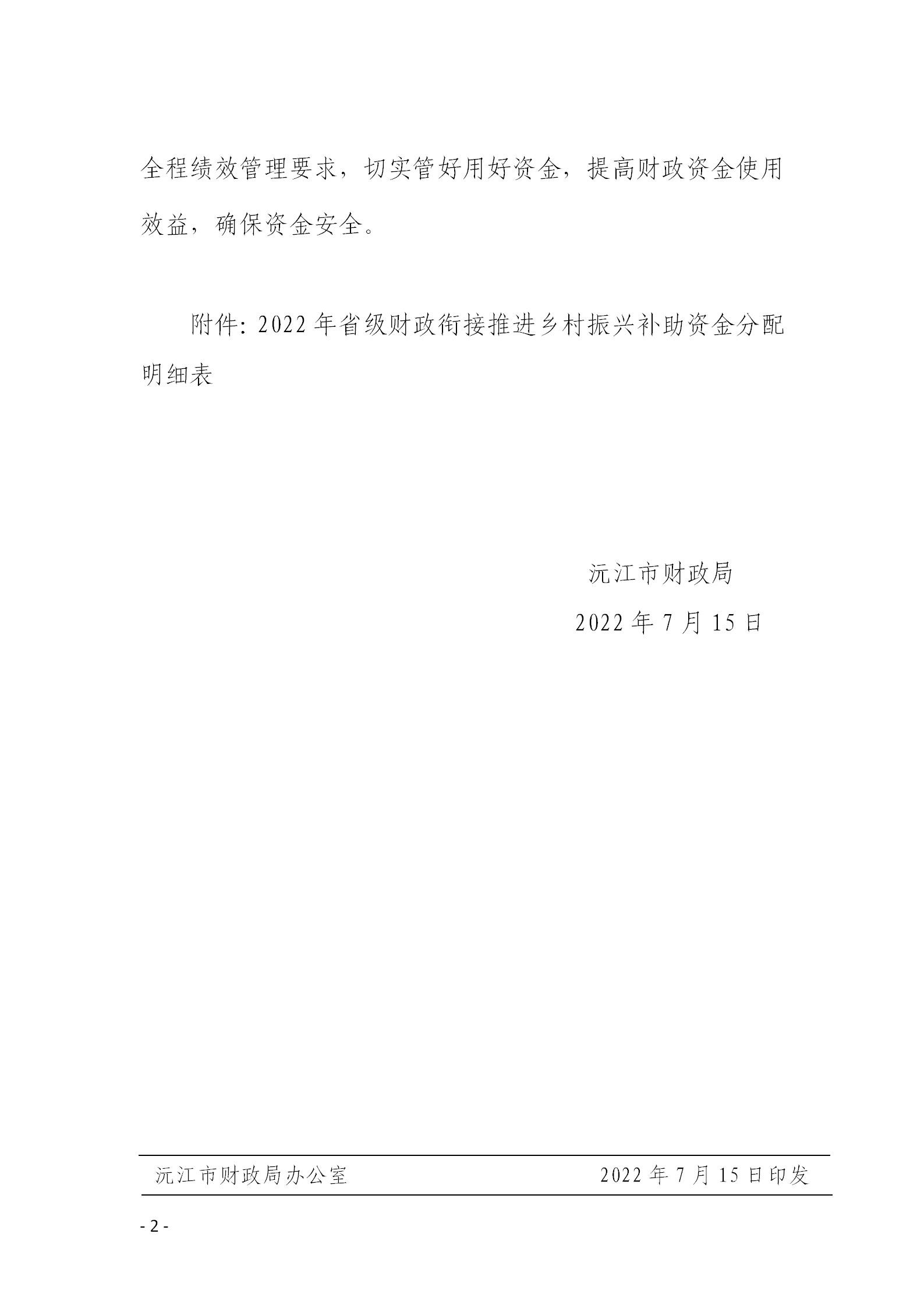 沅财农指〔2022〕15号 沅江市财政局关于下达2022年省级财政衔接推进乡村振兴补助资金的通知