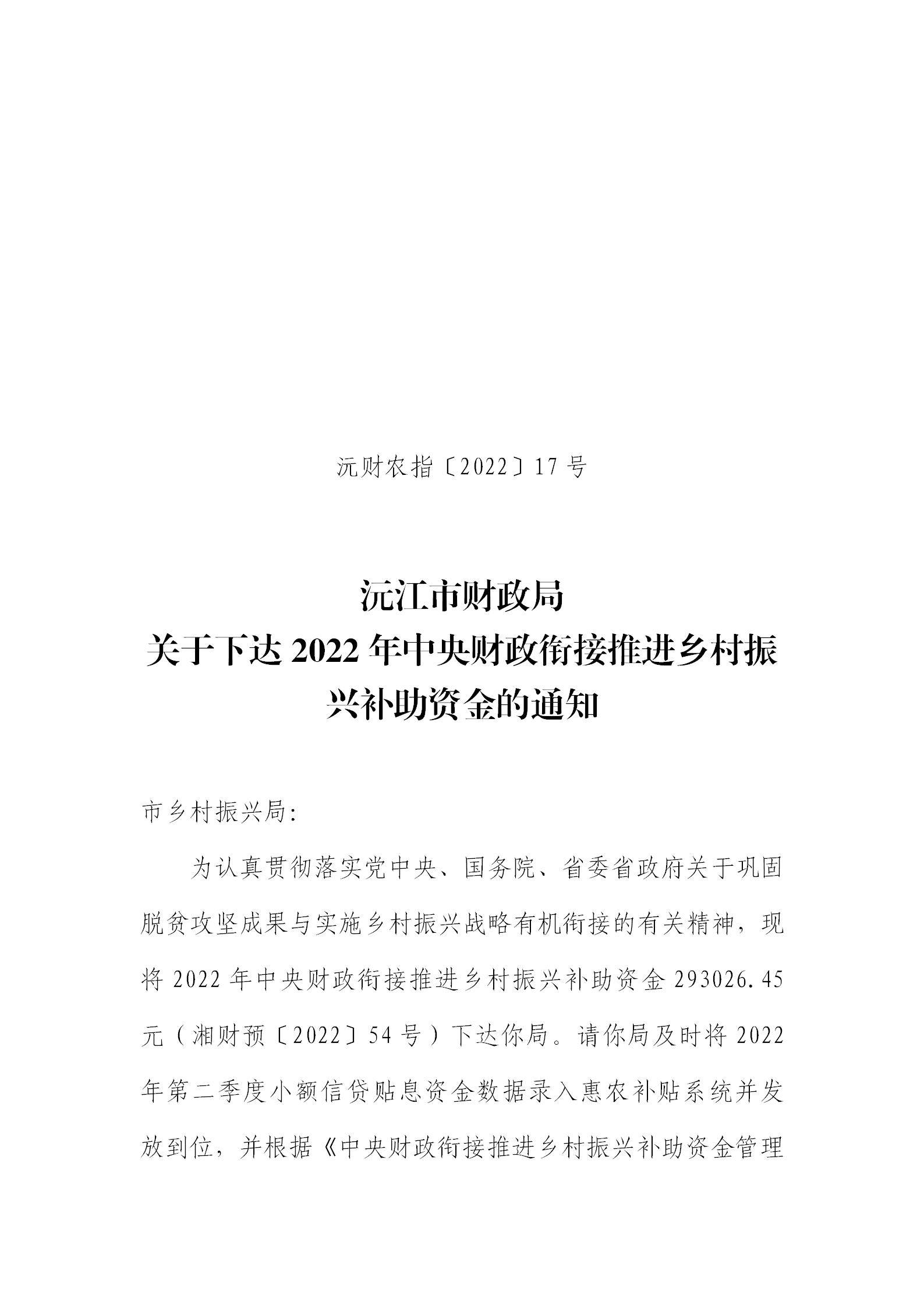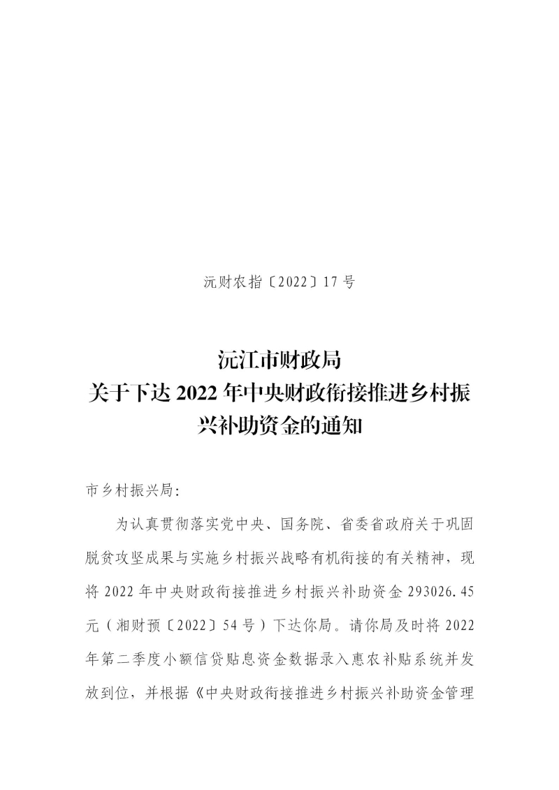 沅财农指〔2022〕17号 沅江市财政局关于下达2022年中央财政衔接推进乡村振兴补助资金的通知.pdf